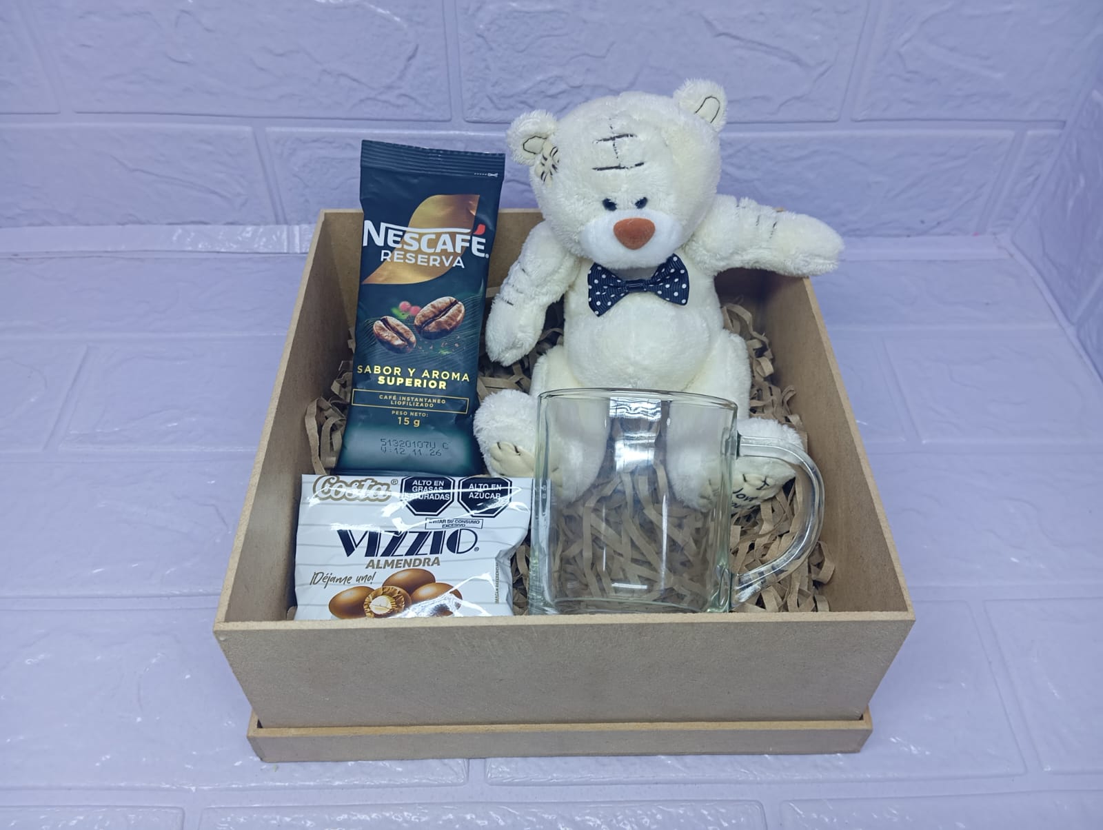 Presentamos nuestro Box Café, una hermosa caja de madera con tapa, cuidadosamente preparada para ofrecer un momento especial con identidad corporativa: