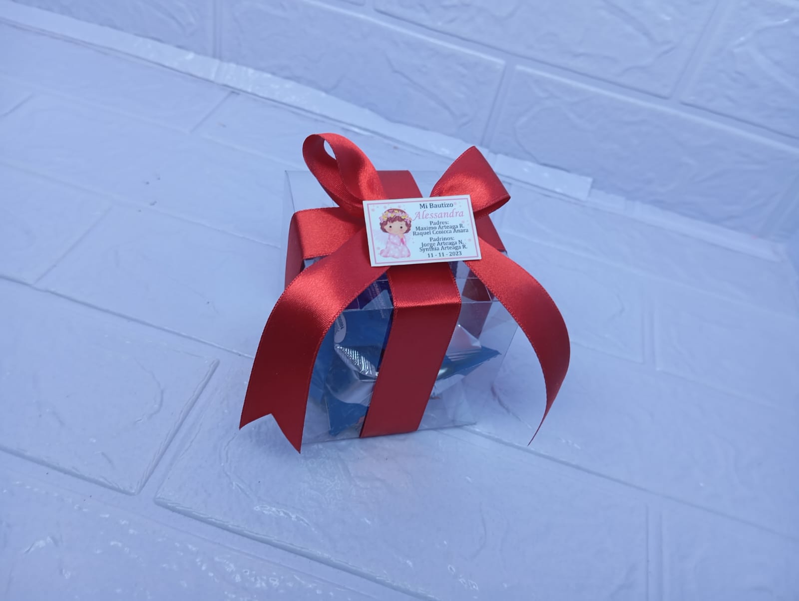 Una delicada caja transparente, decorada con un hermoso lazo de cinta satinada del color que tú elijas, y rellena con 5 deliciosos chocolates surtidos o mix de frutos secos .