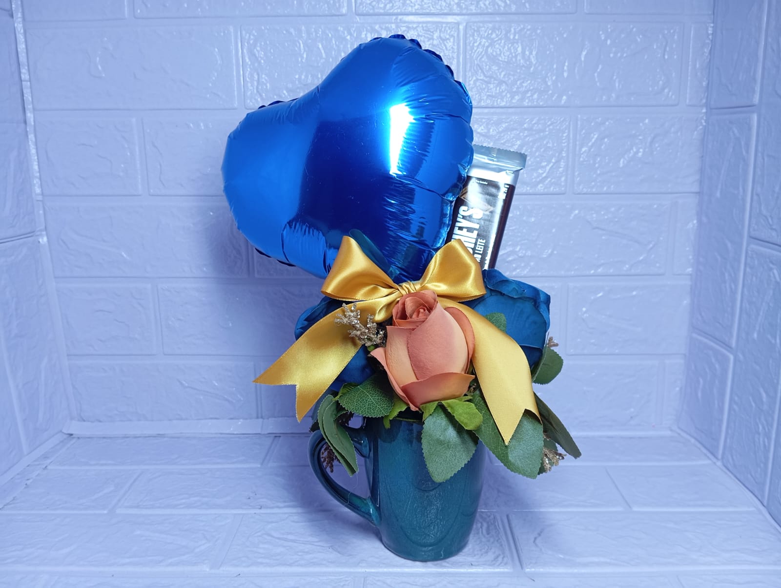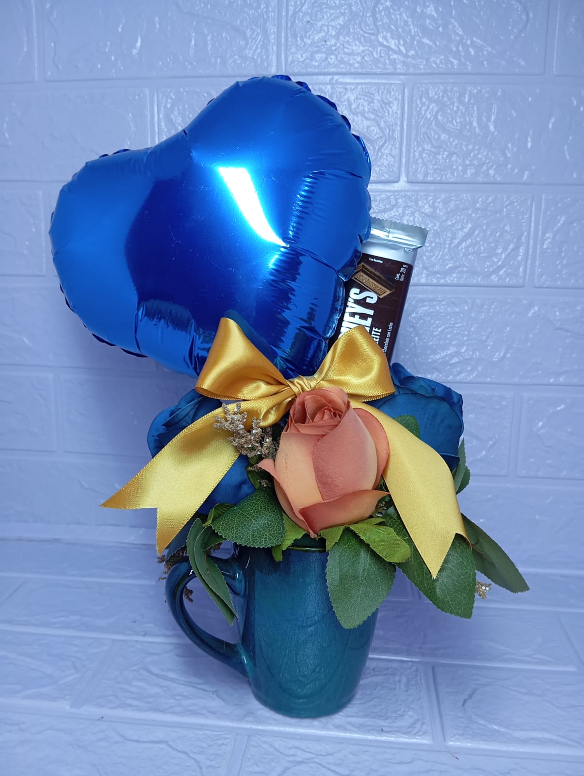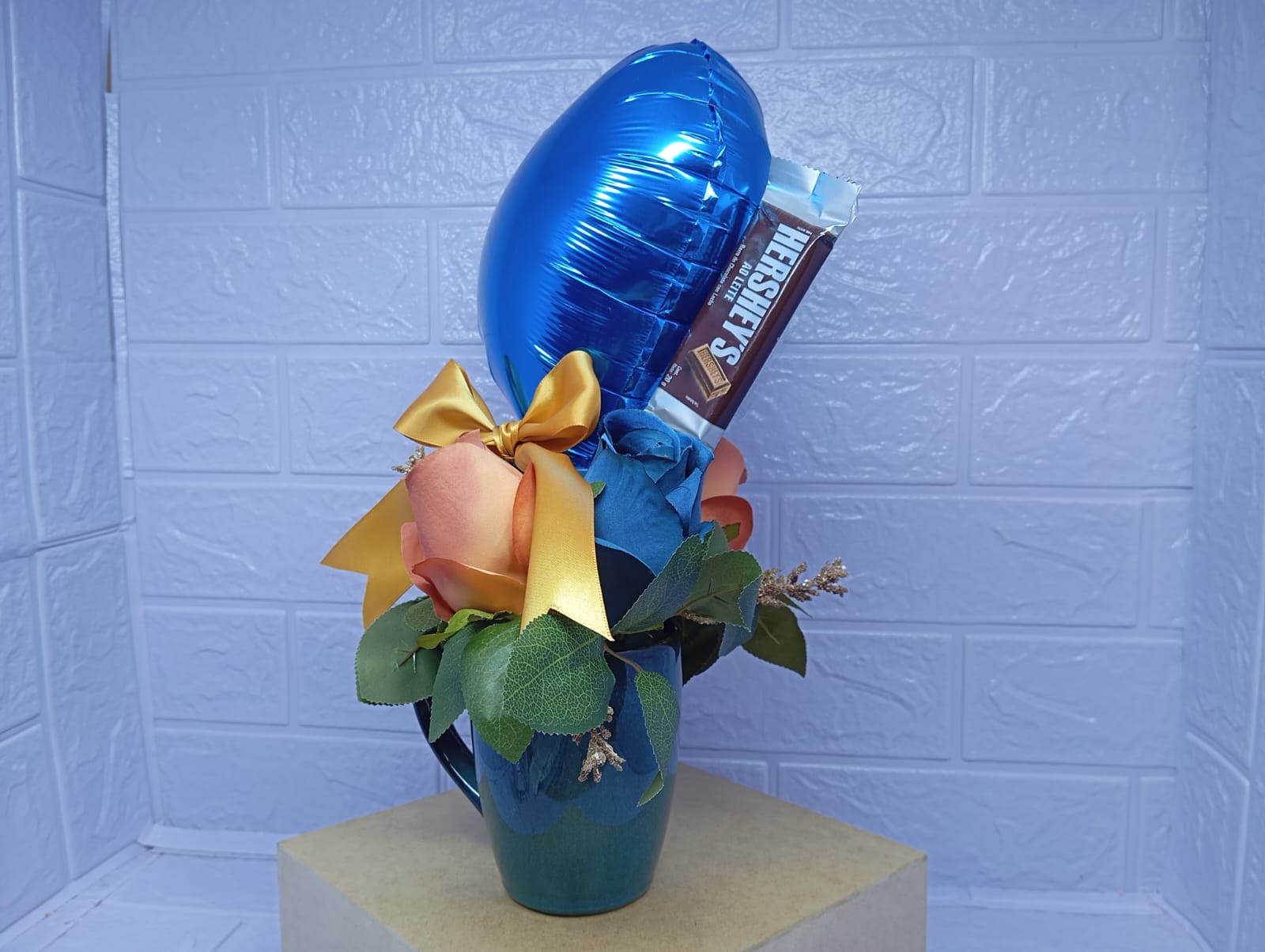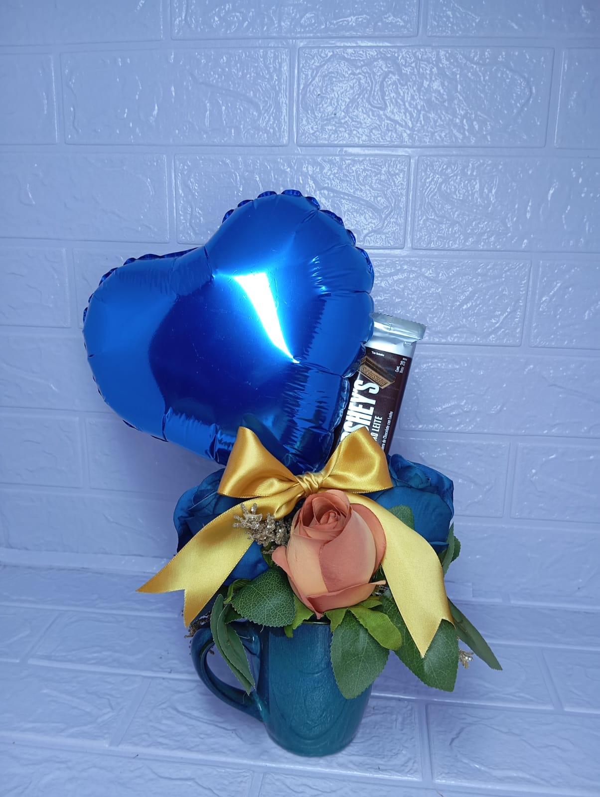 Sorprende a ese hombre especial con esta elegante taza azul, decorada con 4 hermosas rosas artificiales, un globo decorativo y un delicioso chocolatito que endulzará el momento.