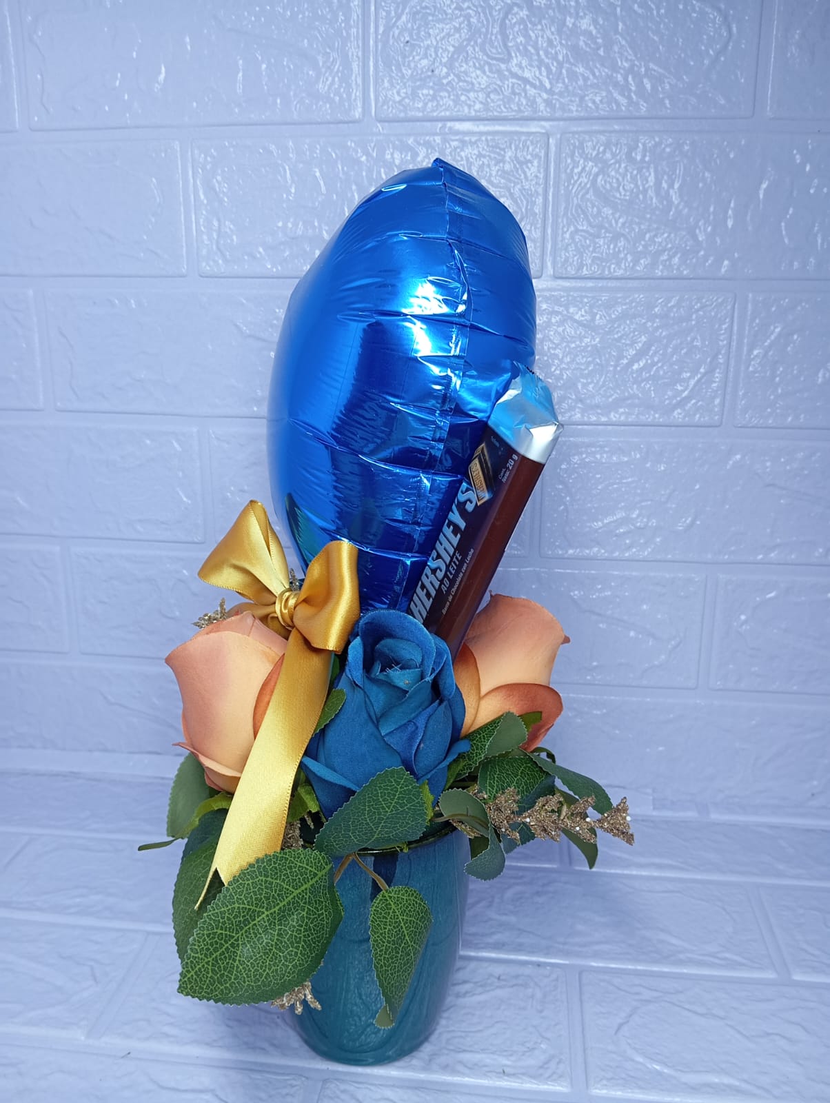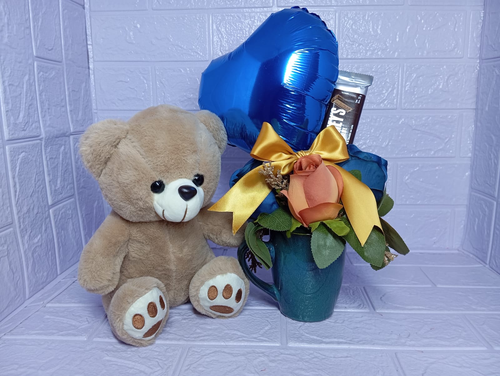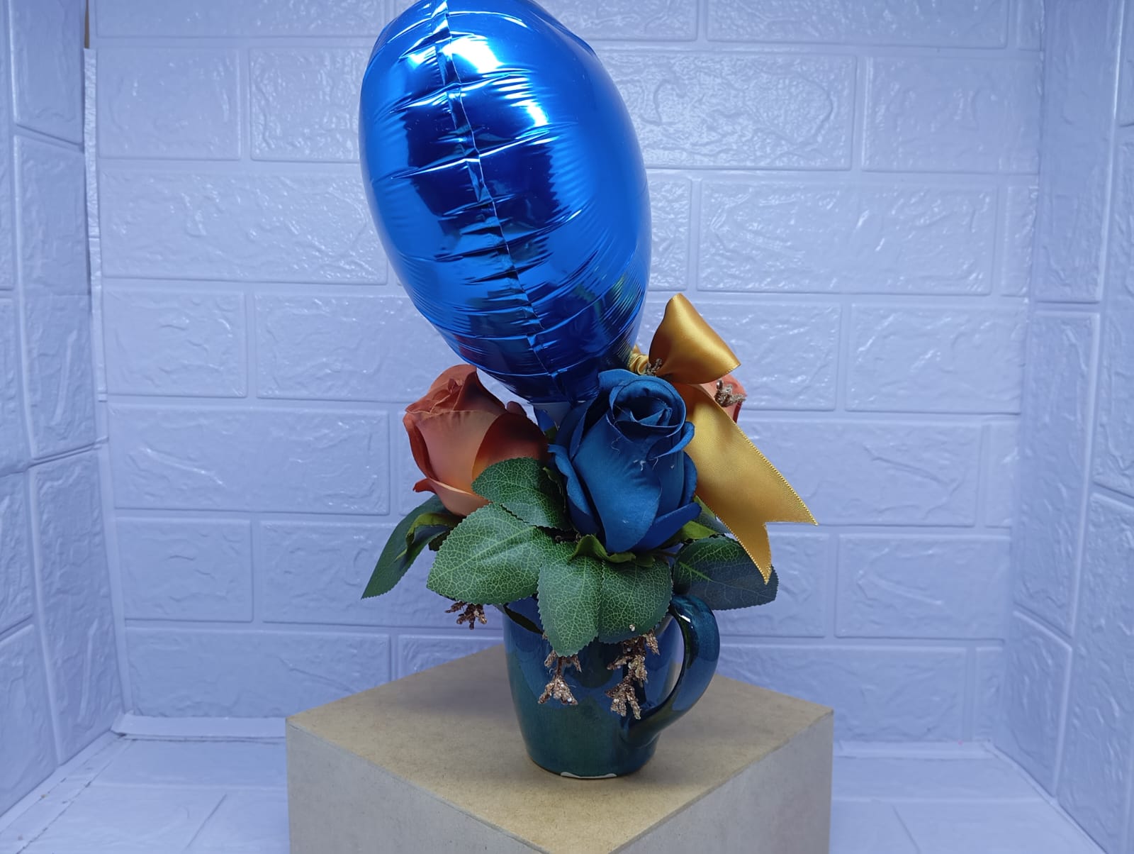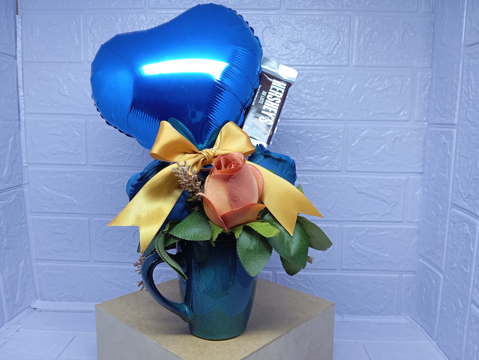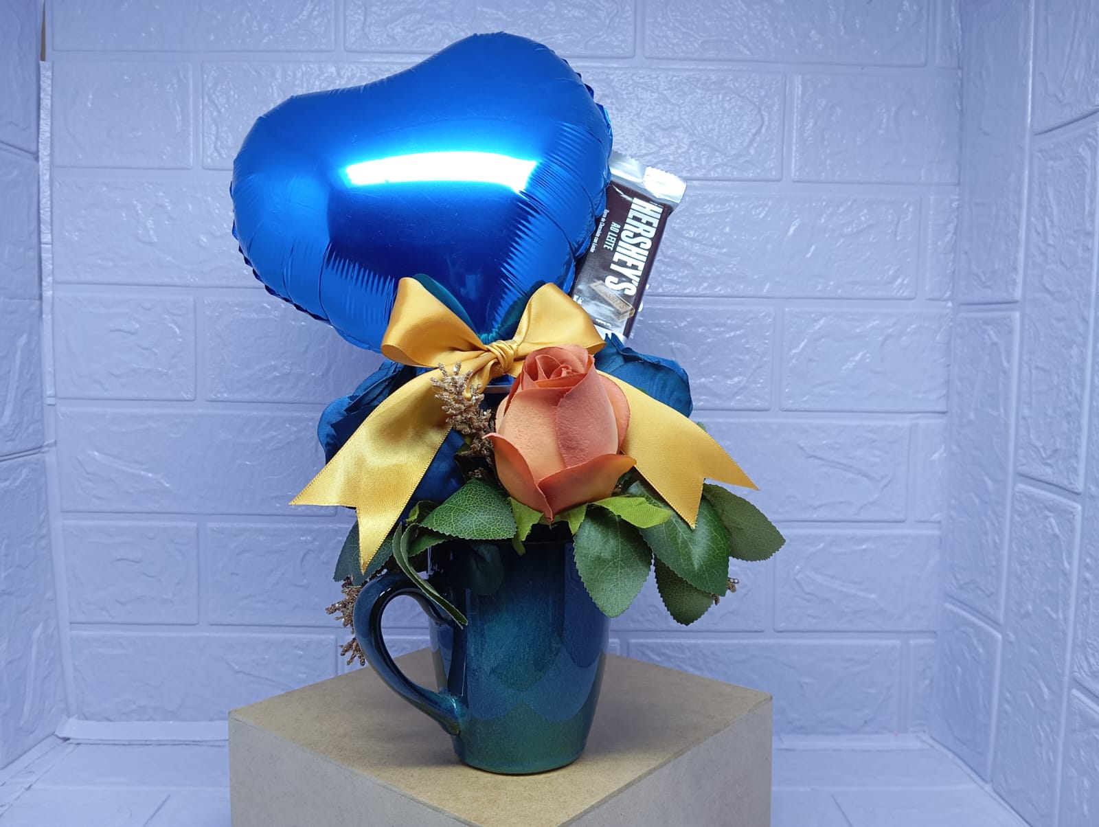 Sorprende a ese hombre especial con esta elegante taza azul, decorada con 4 hermosas rosas artificiales, un globo decorativo y un delicioso chocolatito que endulzará el momento.