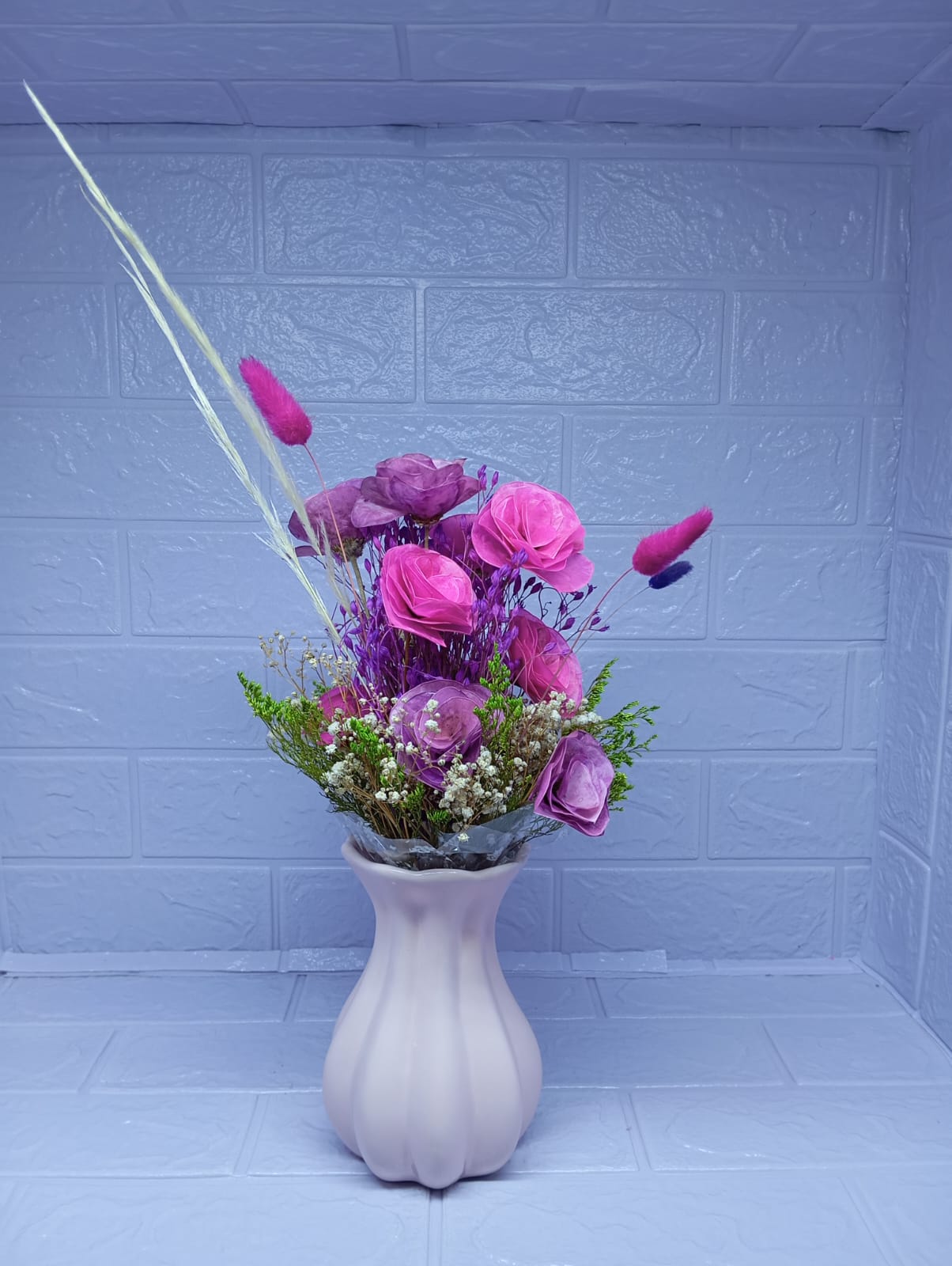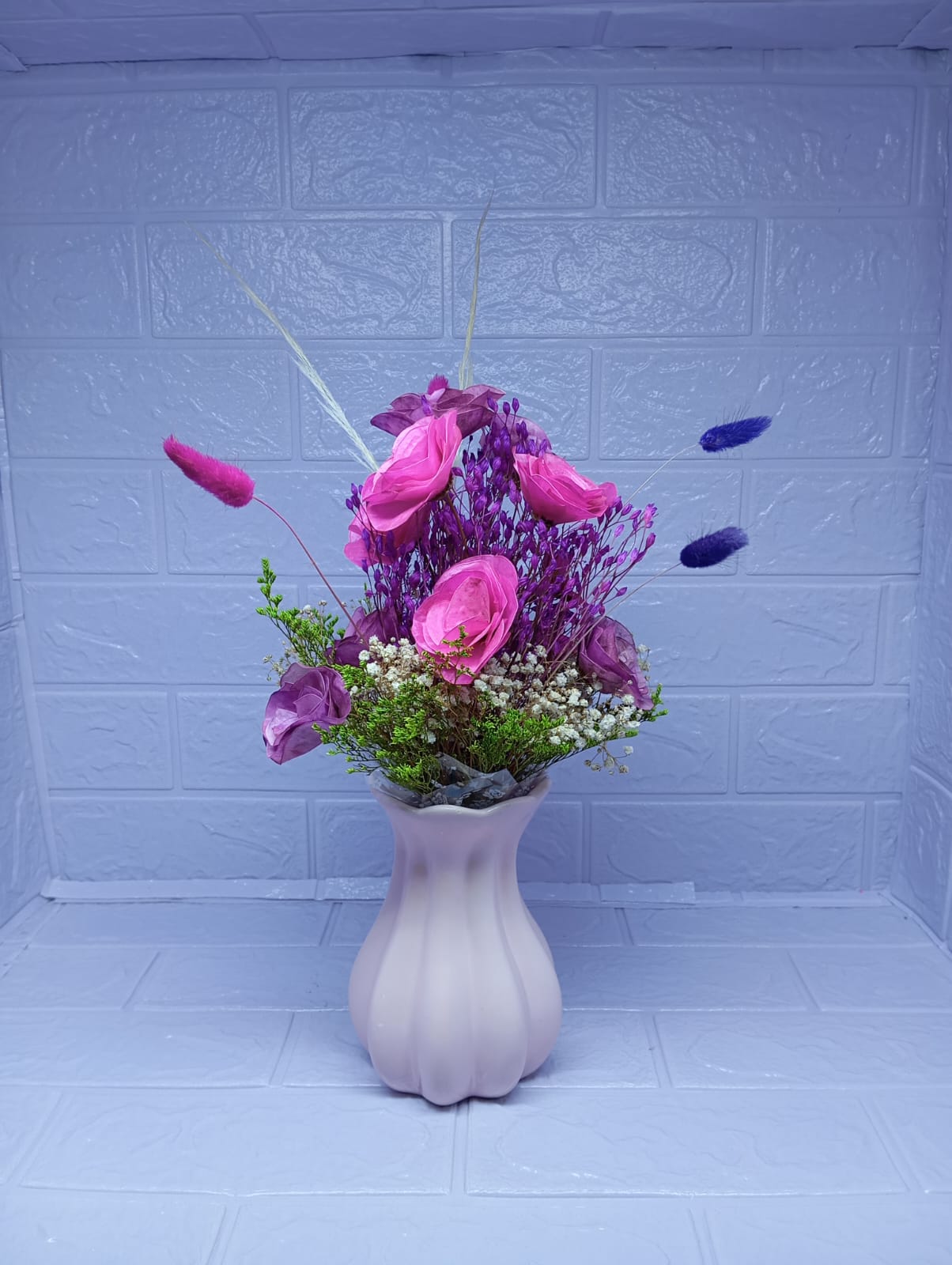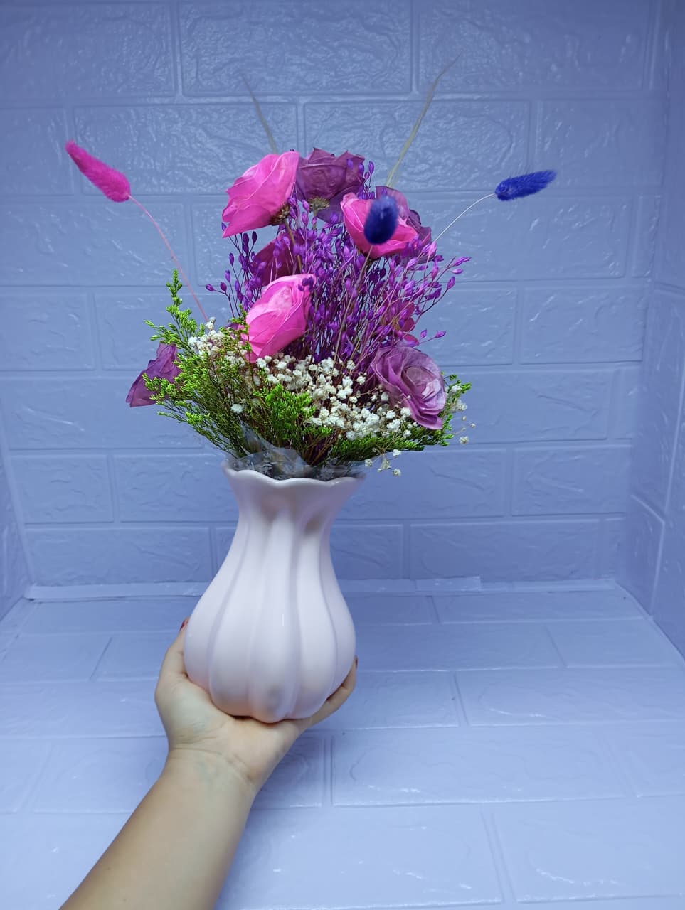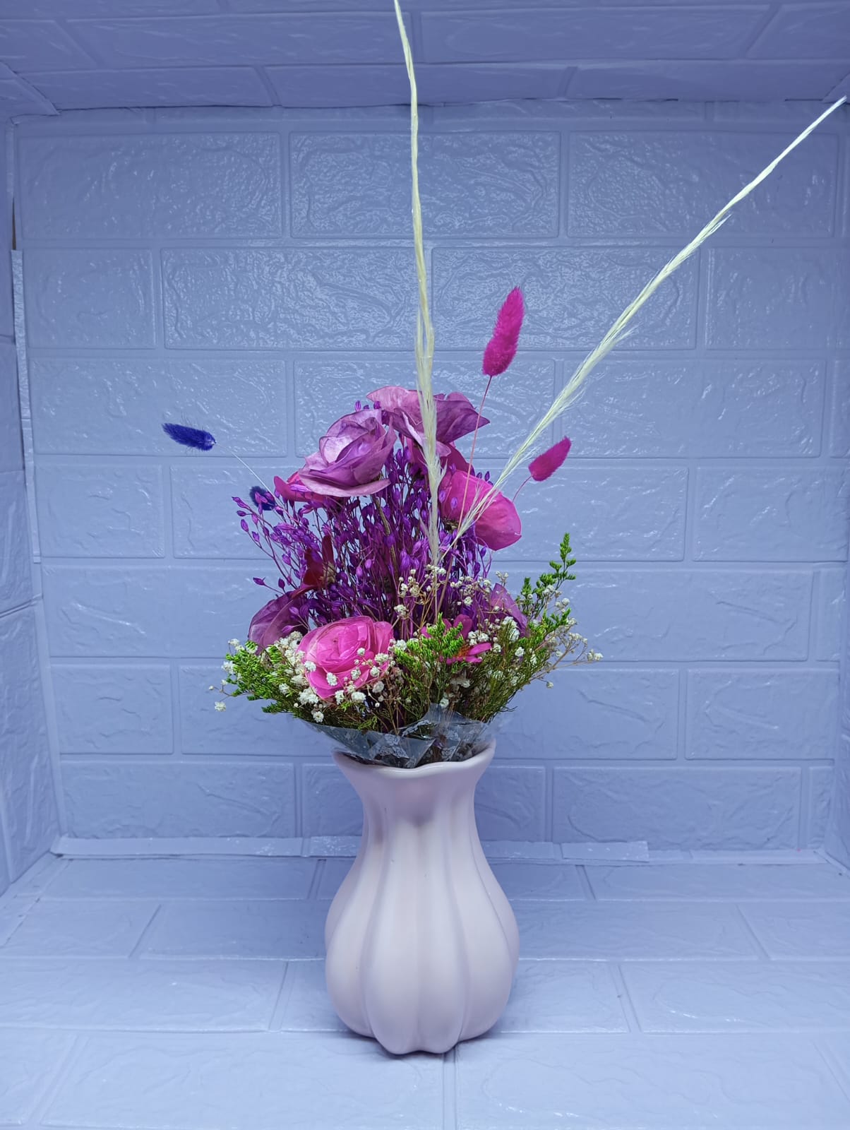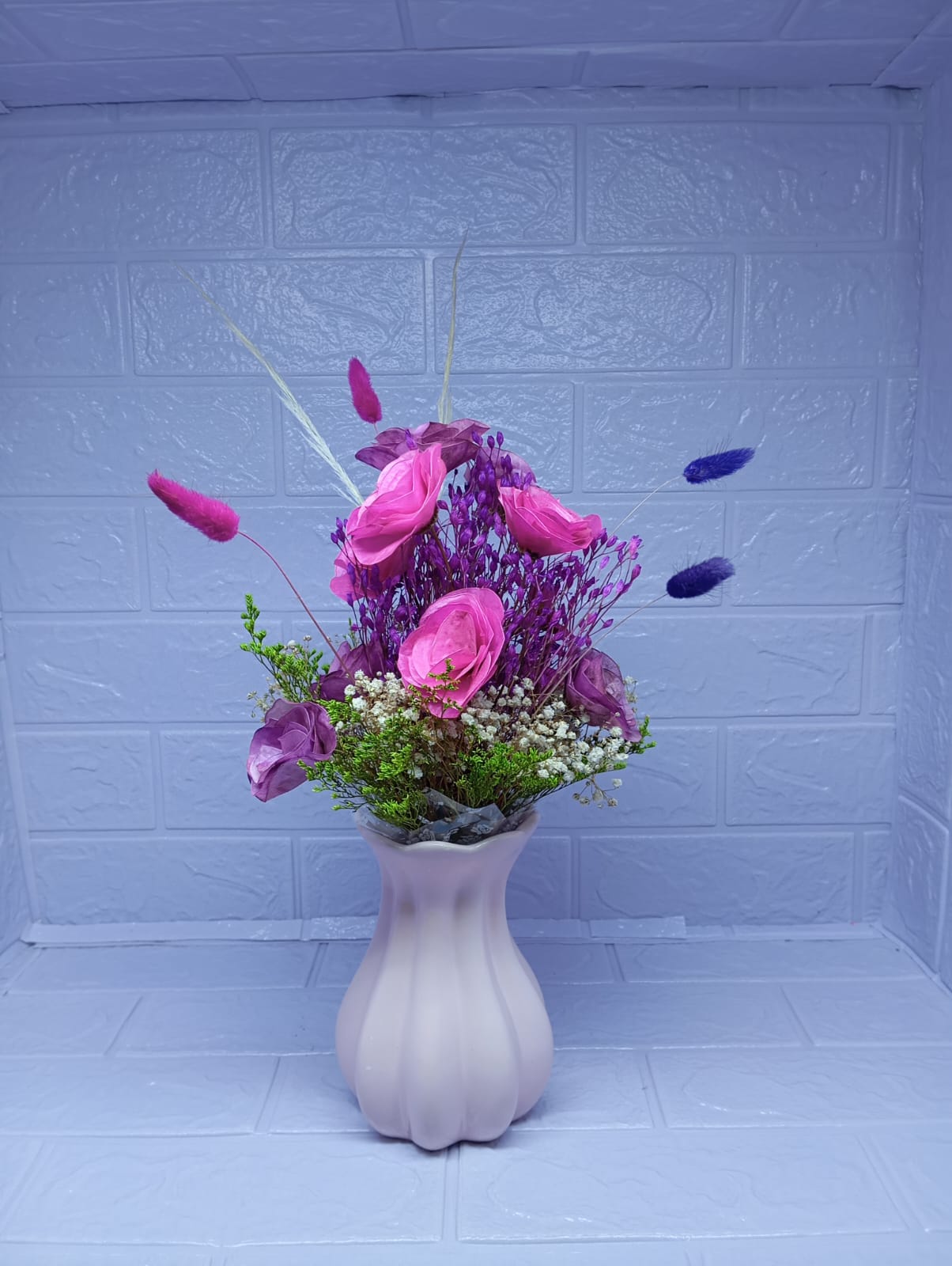 Arreglo floral en una encantadora maceta rosada, con un hermoso follaje que transmite frescura natural. Compuesto por rosas eternas secas y pequeños toques de margaritas, en tonos rosados y lilas que evocan dulzura y ternura en perfecta armonía. Un detalle sutil y encantador para regalar o decorar con amor.