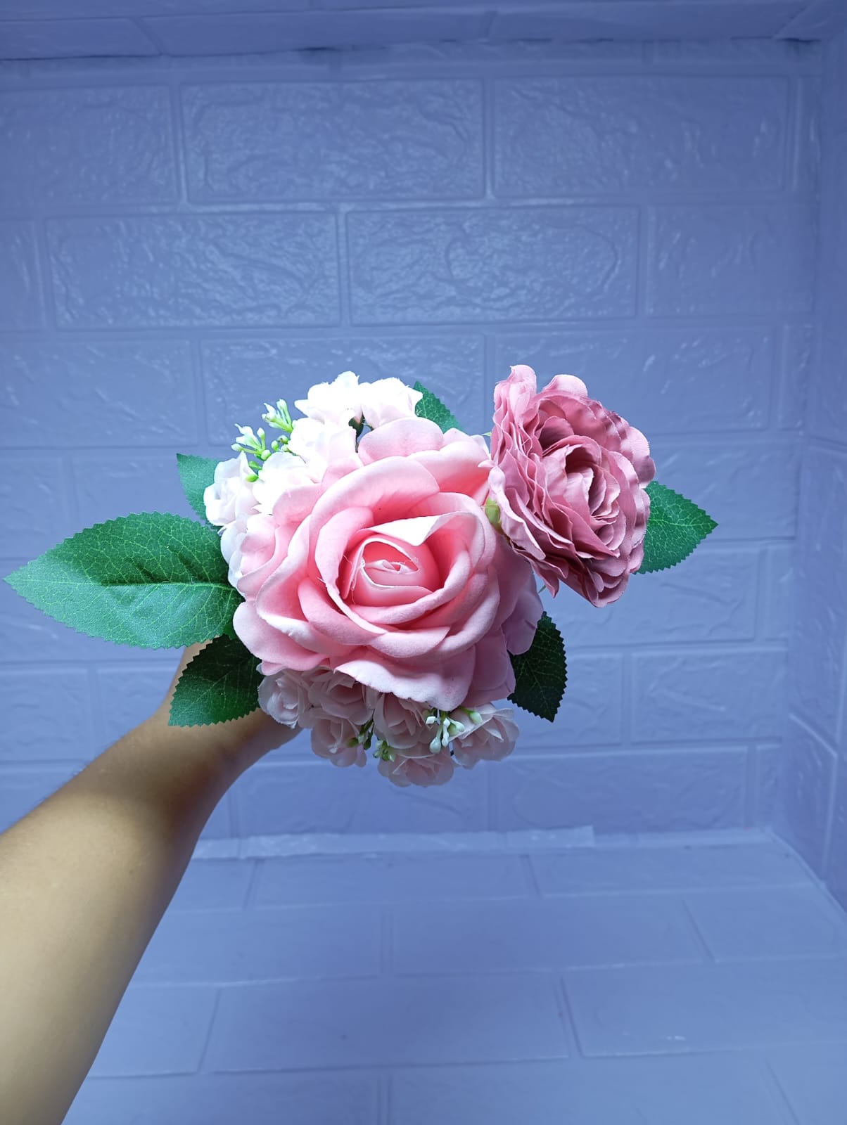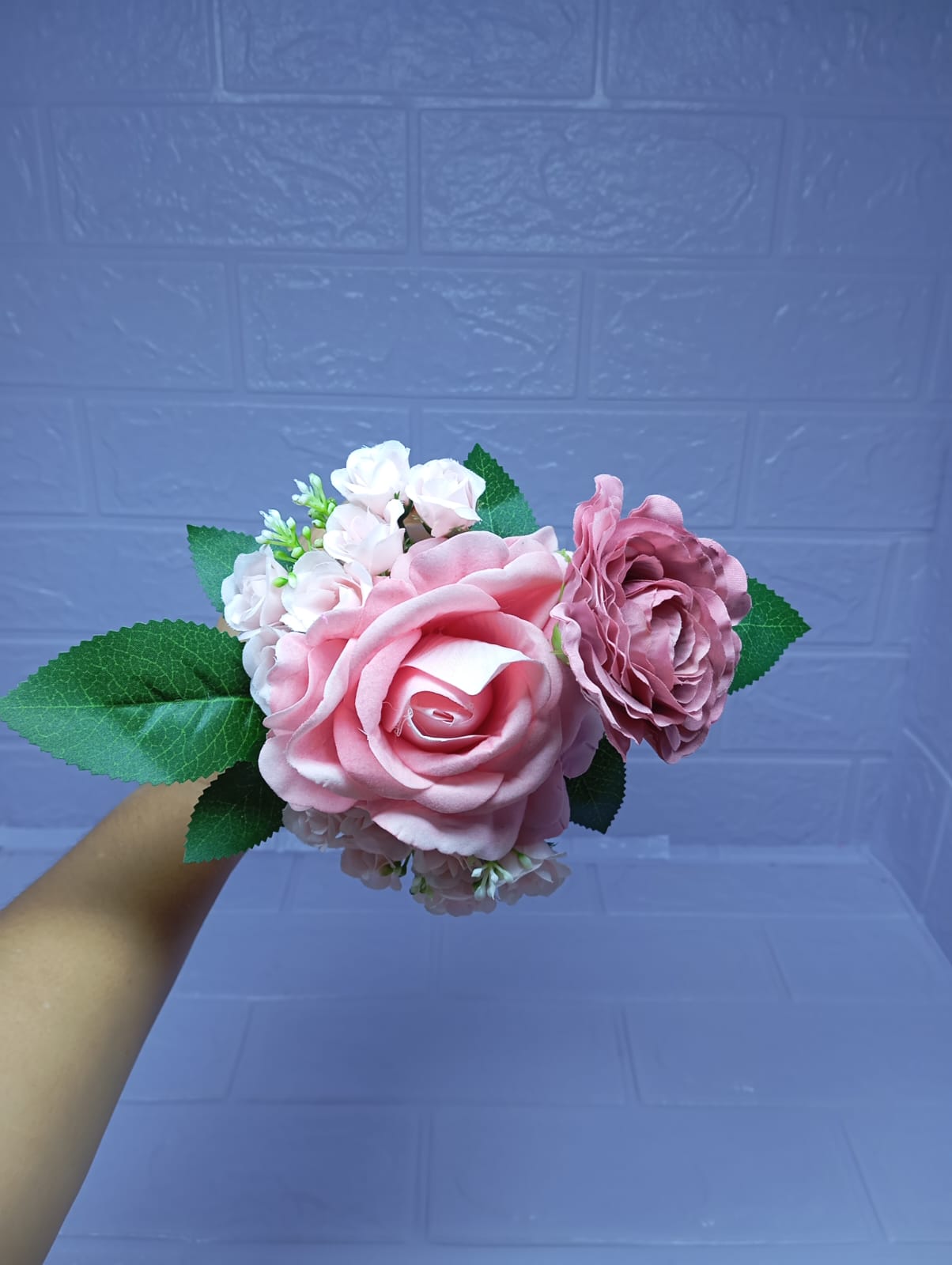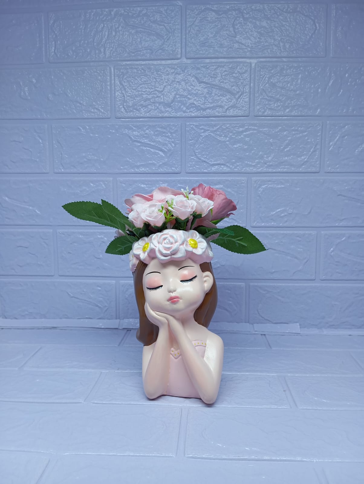 Un hermoso detalle con maceta en forma de niña en tono rosado, decorada con flores artificiales en diferentes tamaños y matices del mismo color. Una pieza dulce y encantadora, acompañada de una tarjeta de dedicatoria para hacerlo aún más especial y significativo.