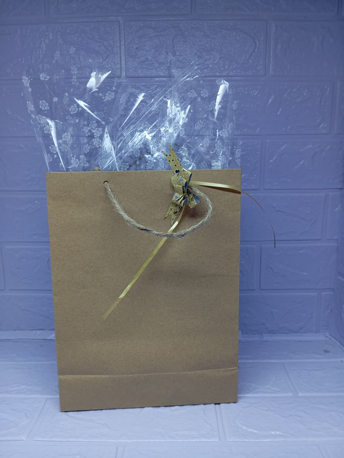 Elegante y delicada, esta bolsa de papel en tono natural incluye un lazo decorativo y viene con celofán transparente para un acabado impecable.