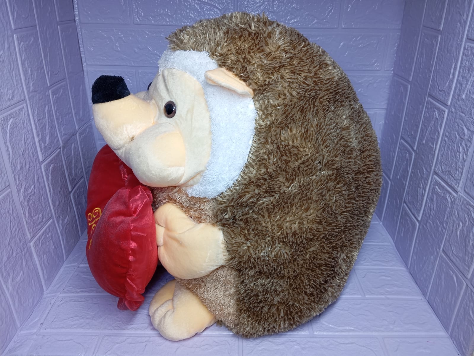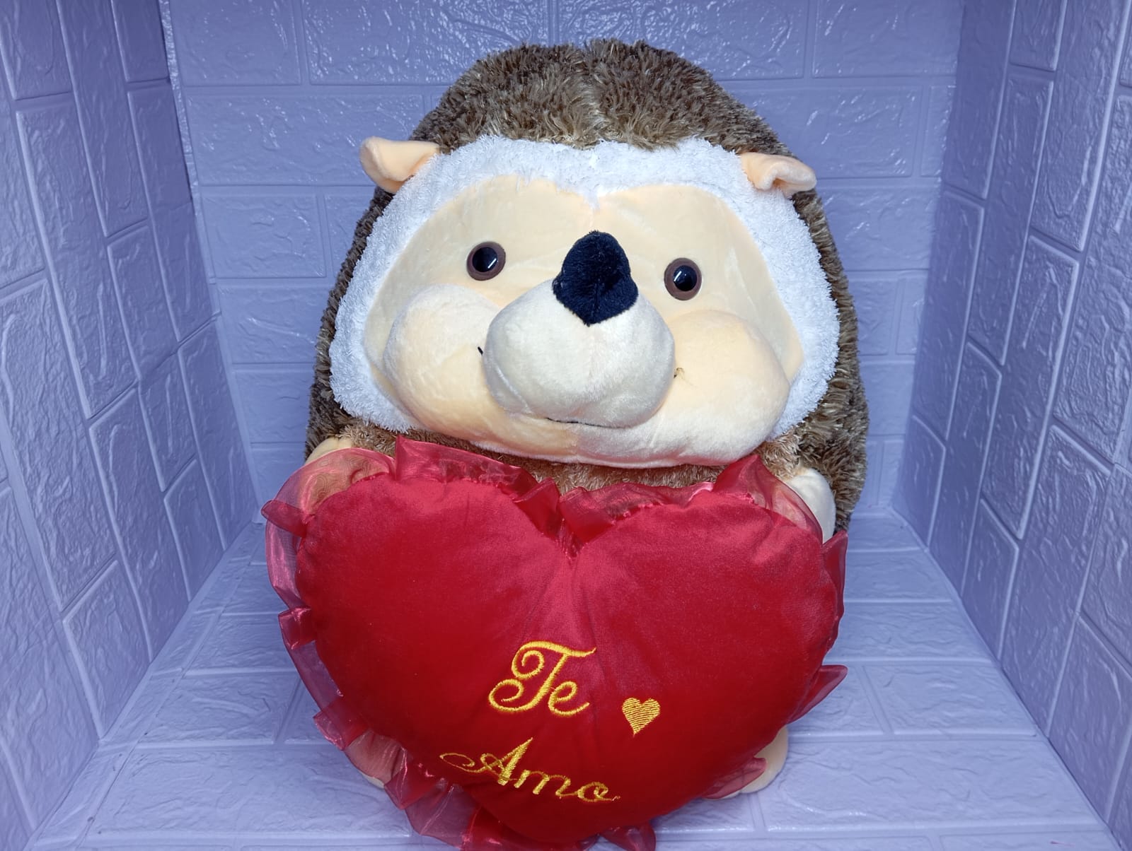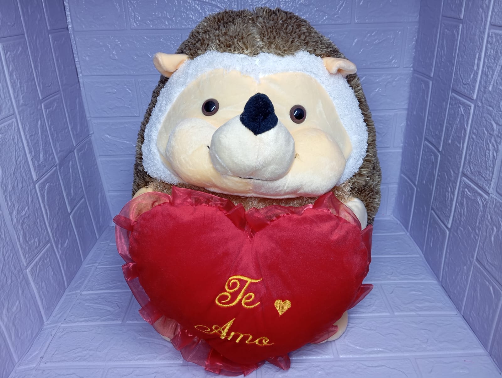 Tierno erizo gordito de 50 cm, con un suave pelaje y un adorable corazón bordado con la frase 'Te Amo'. Perfecto para regalar amor en grande y sorprender con un detalle dulce y original.