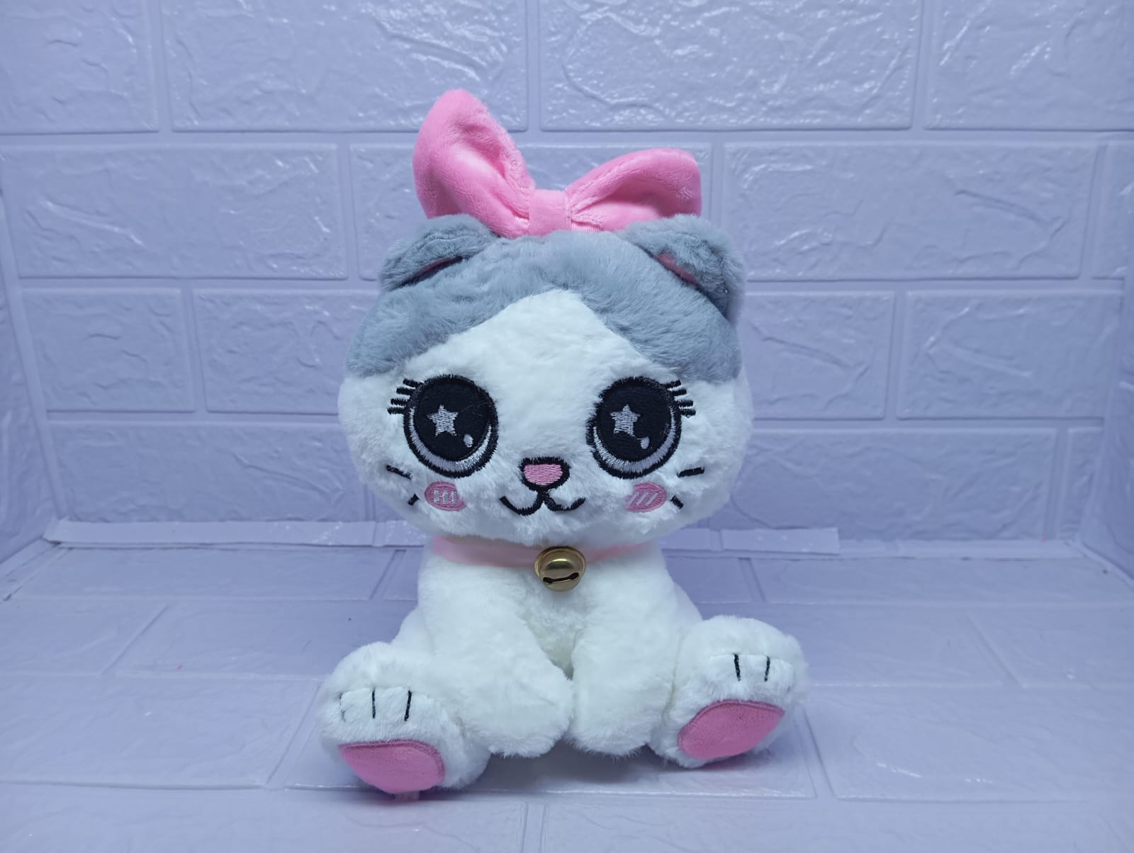 Encantadora gatita de peluche de 25 cm, de suave pelaje blanco con delicadas manchas plomas. Lleva un coqueto lazo fucsia en la cabeza y una sonaja en el cuello que suena suavemente al moverla. Un detalle adorable que transmite dulzura y alegría en cada abrazo.
