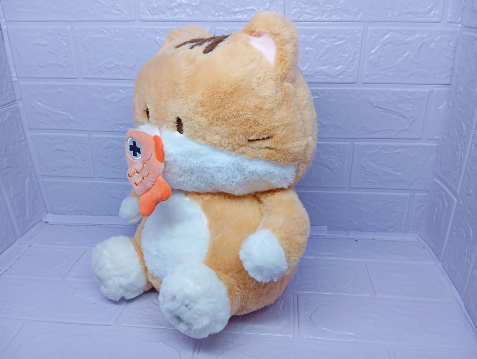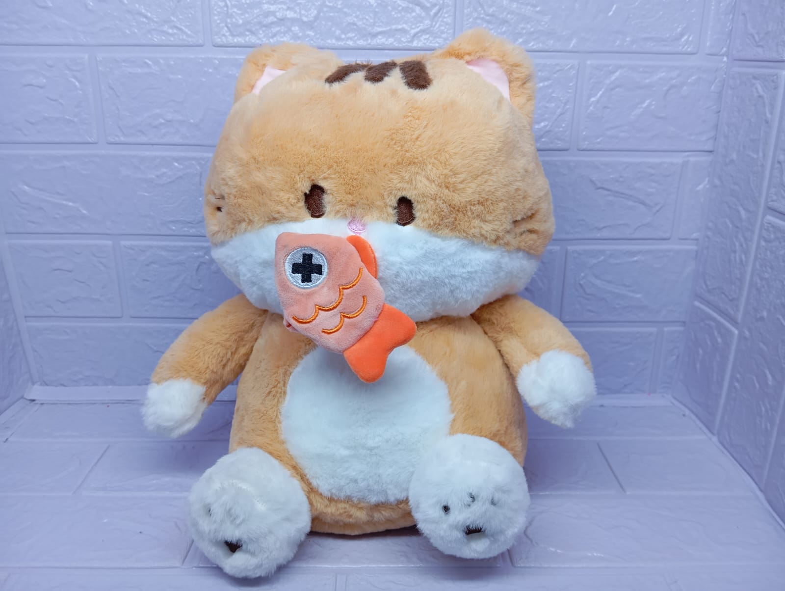 Tierno gato de 37 cm con un suave pelaje y un divertido pescado retráctil en la boca. Su expresión dulce y su detalle juguetón lo convierten en el regalo perfecto para amantes de los gatitos y momentos llenos de ternura.