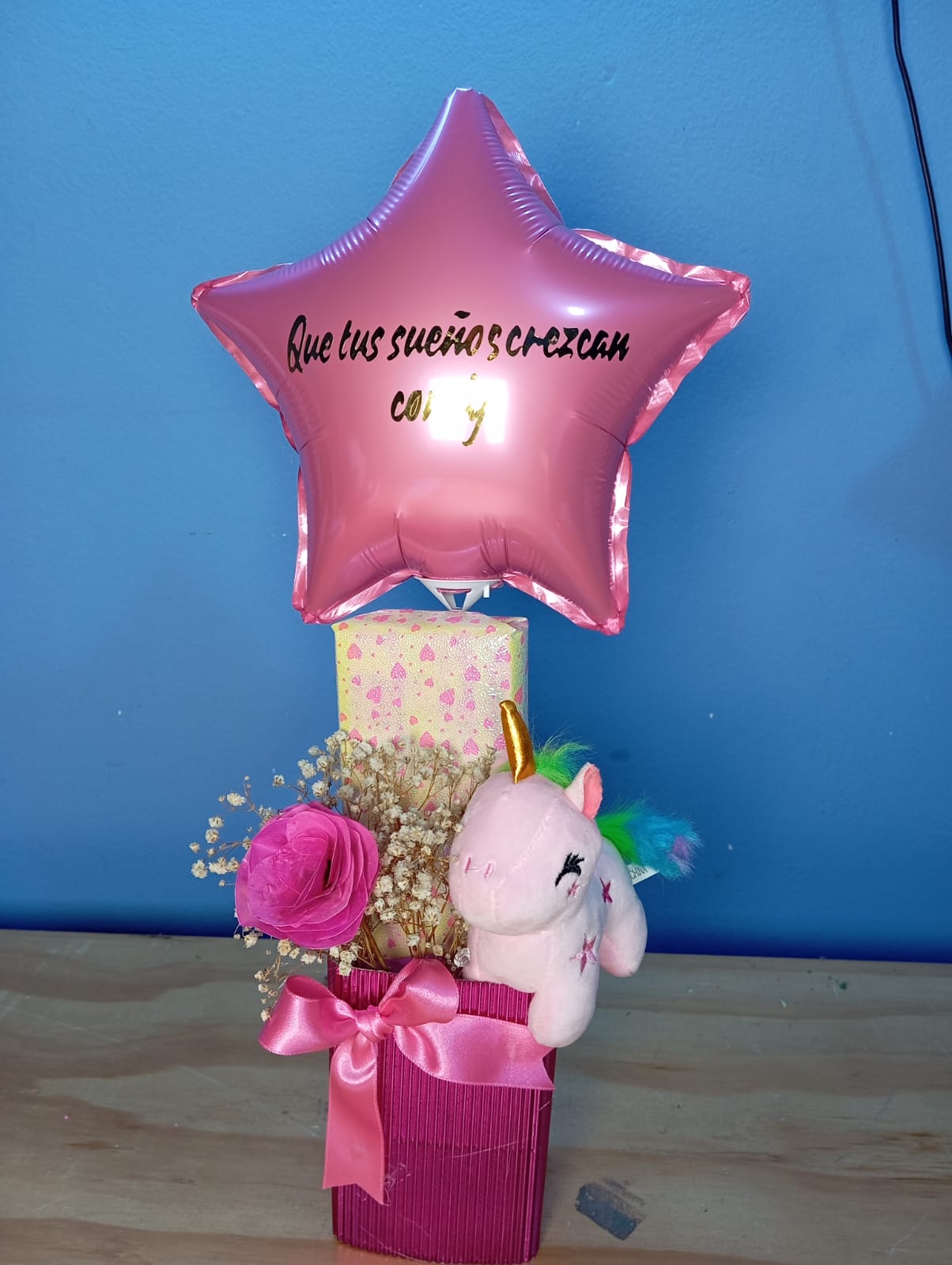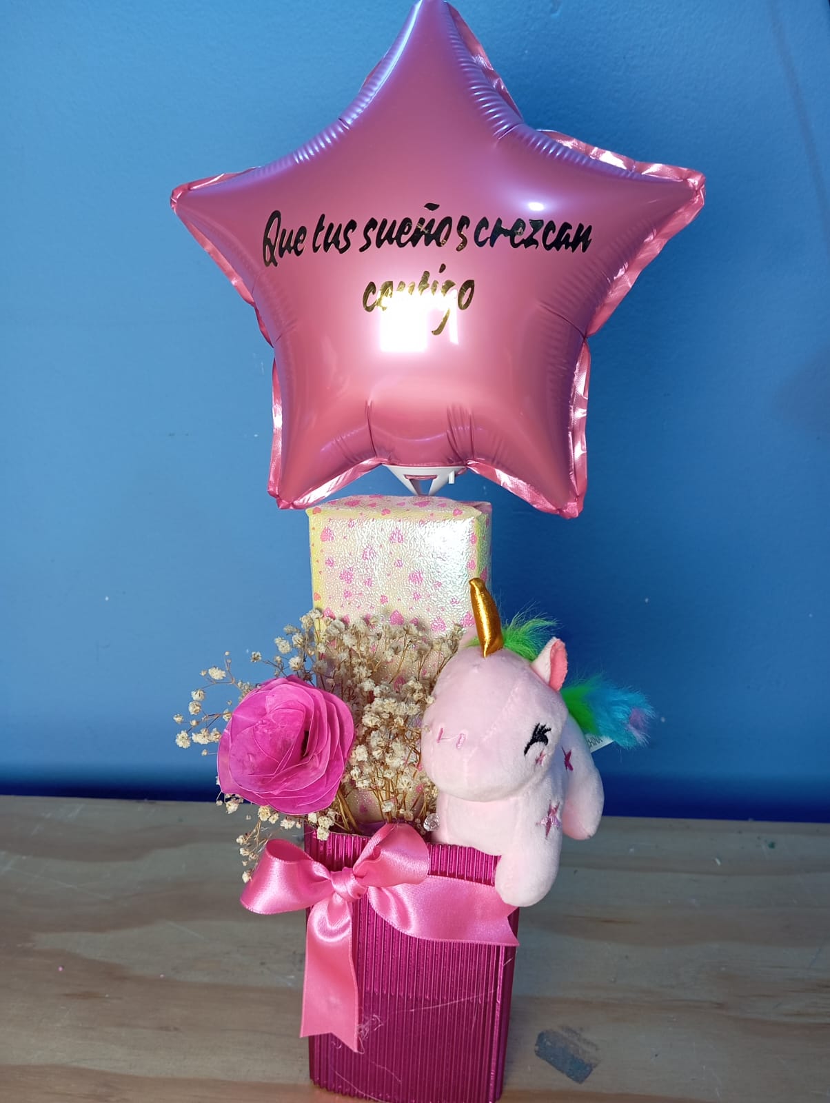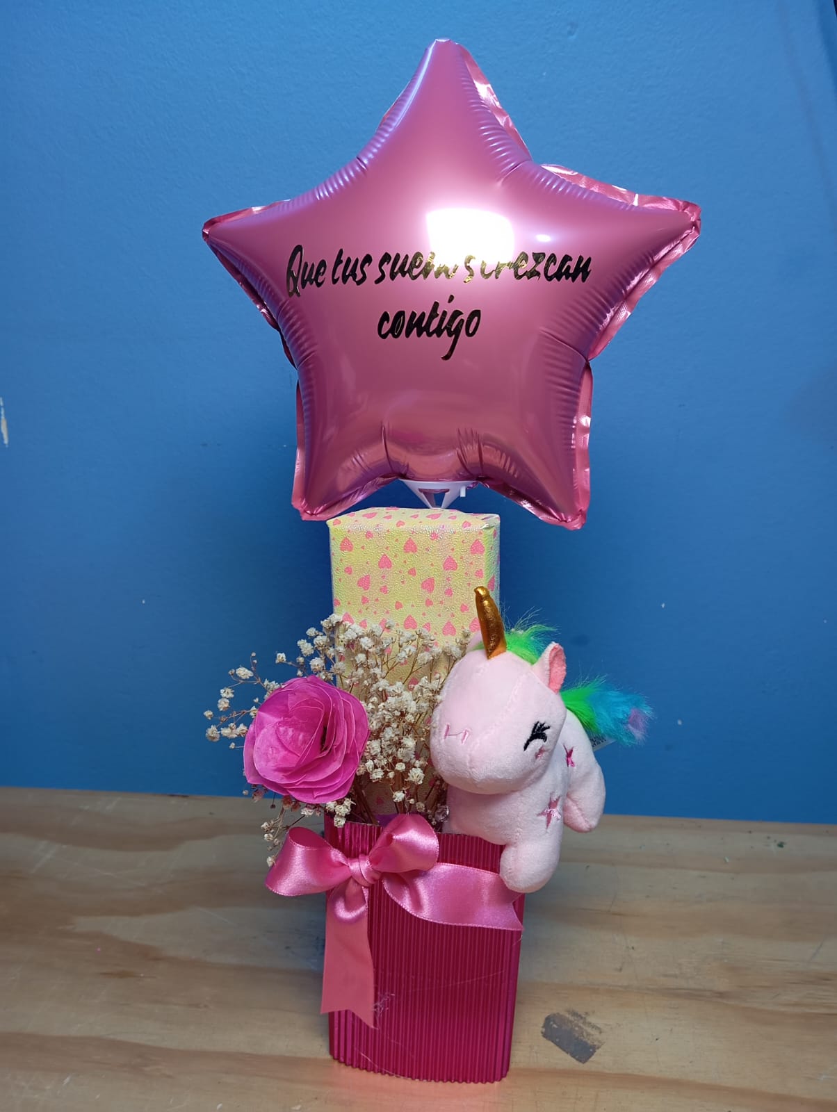 Incluye una deliciosa caja de chocolate Vicio, decorada con un adorable peluchito llavero (puedes elegir entre unicornio, caballito, delfín u osito), un ramito de flores eternas preservadas y un globo con mensajito que le da el toque final perfecto.