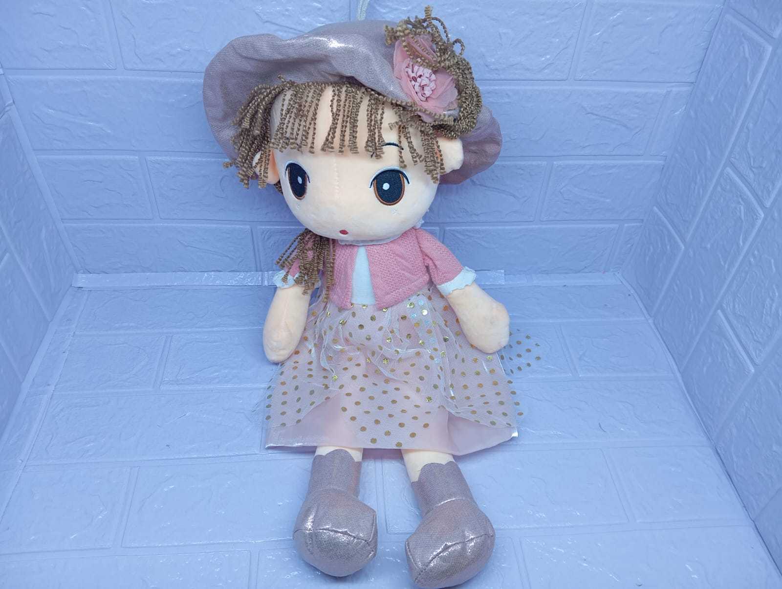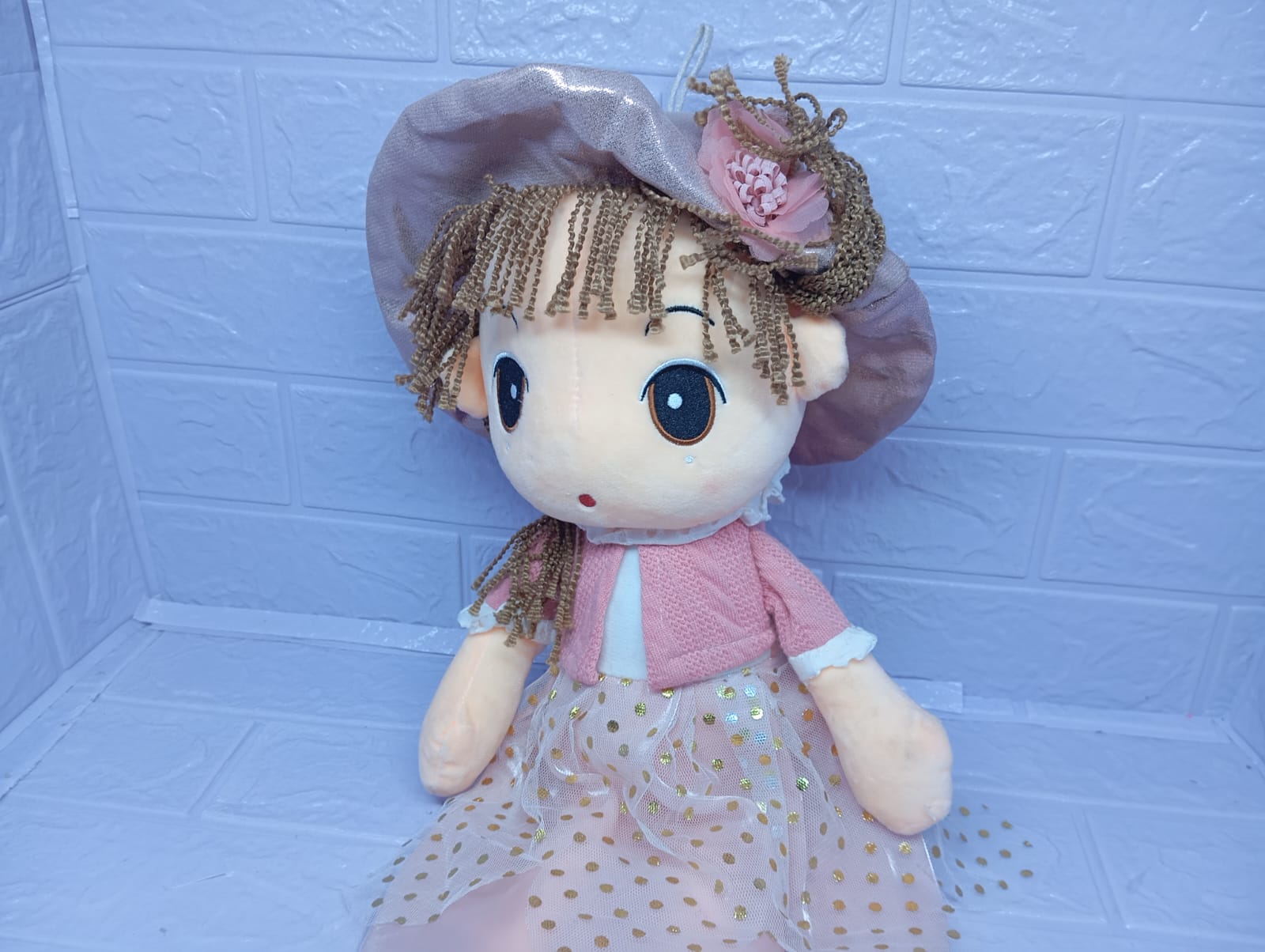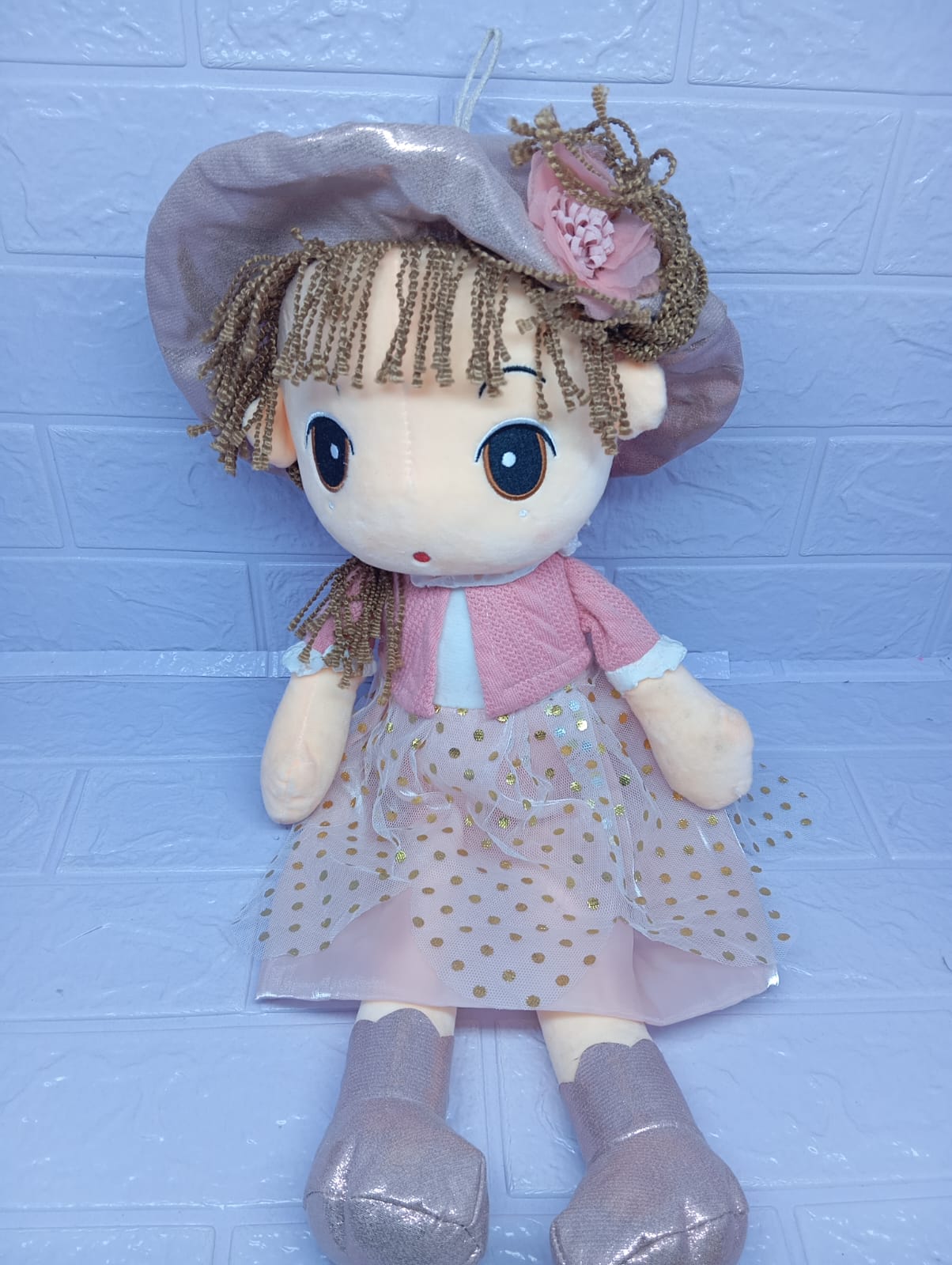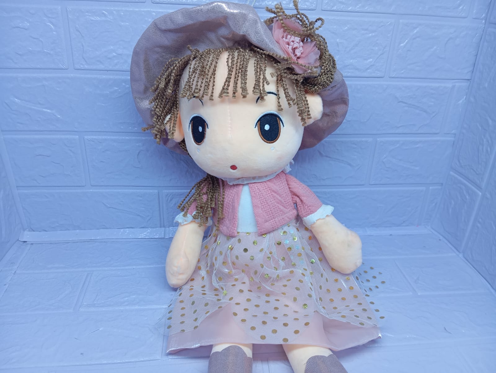 Hermosa muñeca de peluche de 45 cm con un tierno vestido lleno de detalles. Suave, delicada y adorable, es un regalo especial que transmite dulzura y ternura en cada abrazo.
