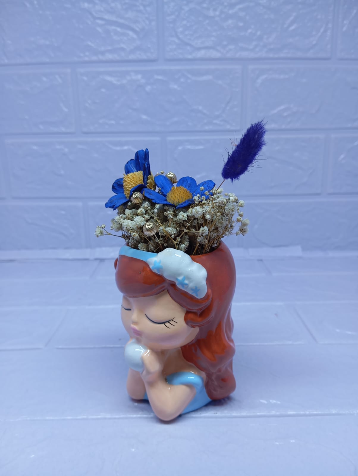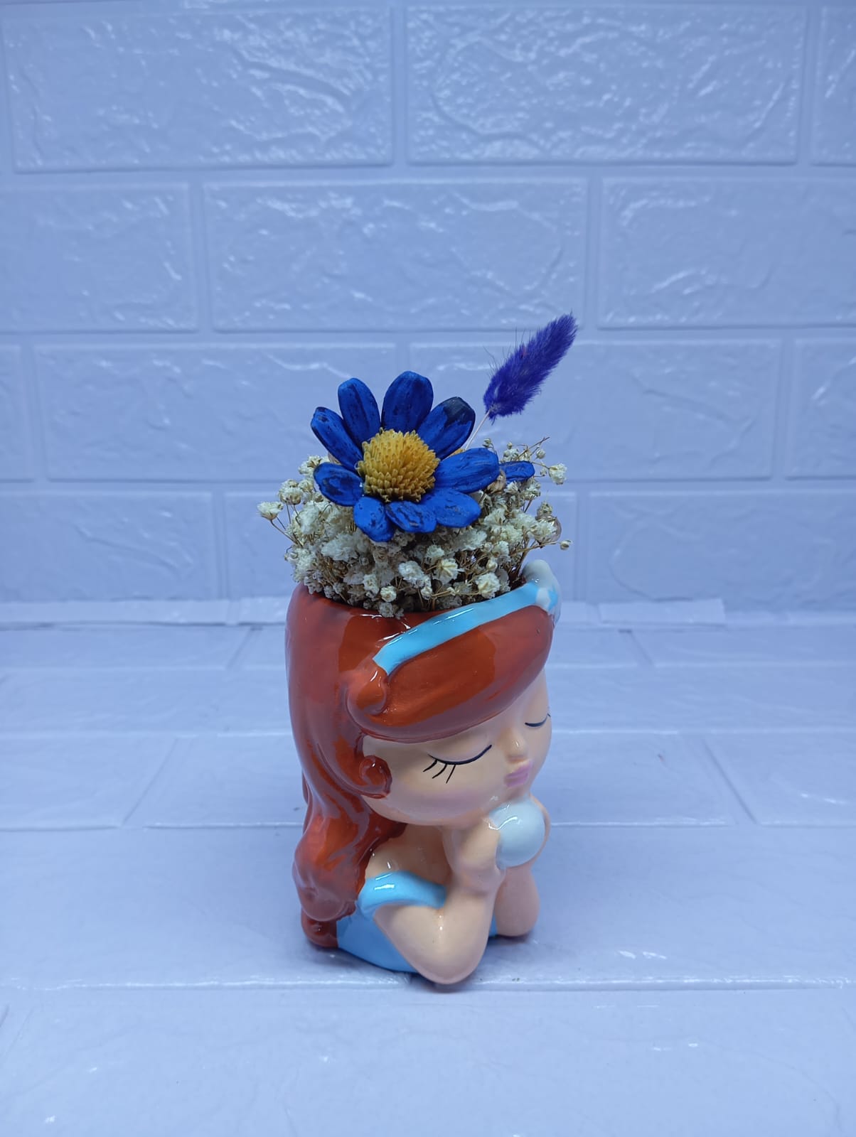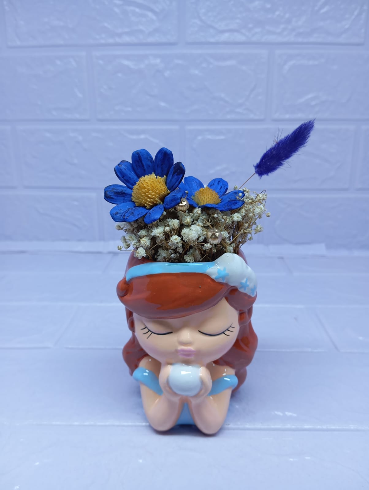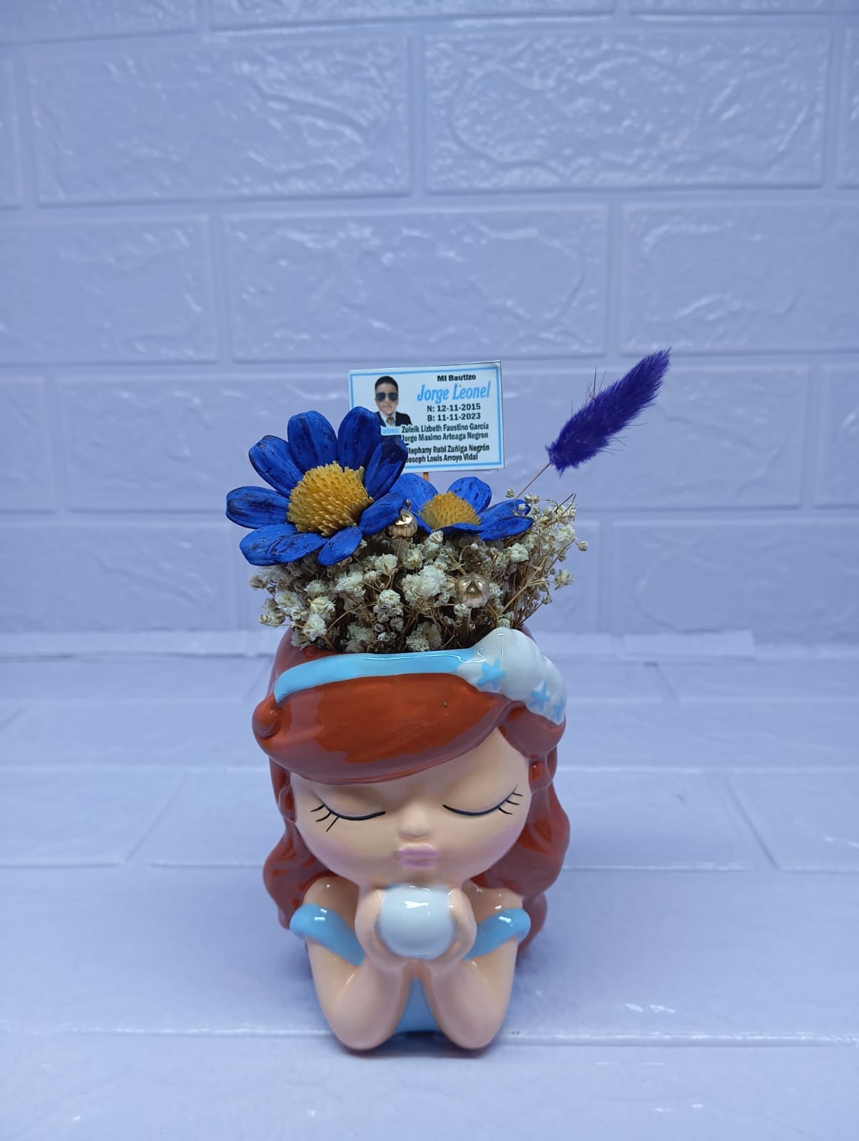 Una hermosa maceta con forma de niña, que sostiene en sus manos una esfera con delicadas margaritas eternas. Puedes elegir el color de las flores según tu preferencia o personalizarla con los tonos de tu marca. Un detalle único, dulce y encantador, que también permite incorporar tu logo para hacerlo aún más especial.