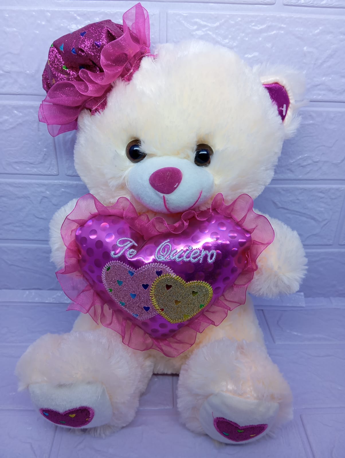 Tierna osa de peluche de 30 cm, con un dulce sombrero y un corazón rosado que dice 'Te quiero'. Al presionarla, emite una melodía suave y especial que acompaña perfectamente este detalle lleno de ternura. Ideal para regalar amor con estilo y dulzura.
