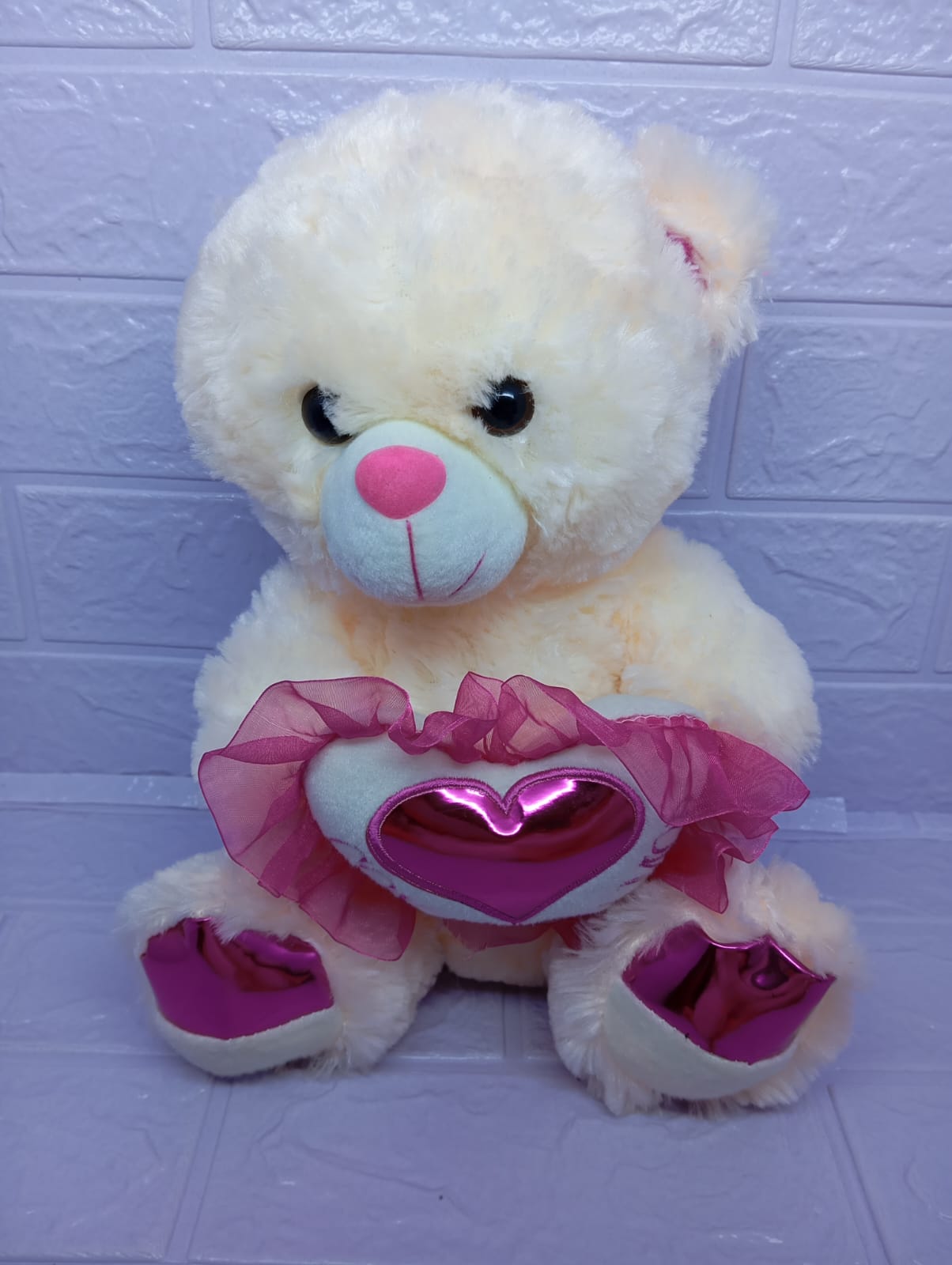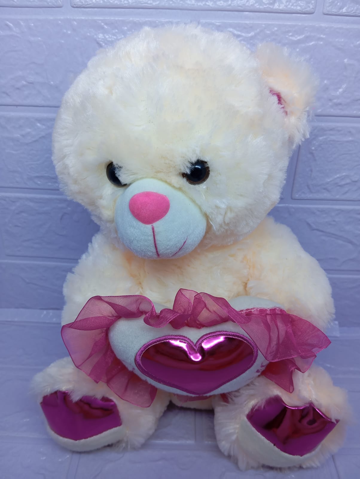 Oso de peluche de 30 cm con un hermoso corazón fucsia que destaca por su color vibrante y su ternura. Incluye un detalle musical que se activa al presionarlo, haciendo de este peluche un regalo perfecto para expresar amor con un toque especial.