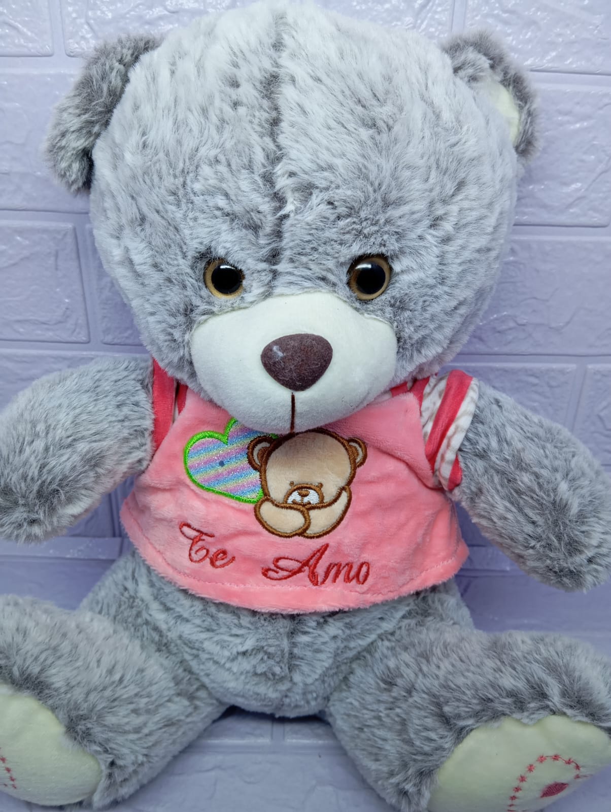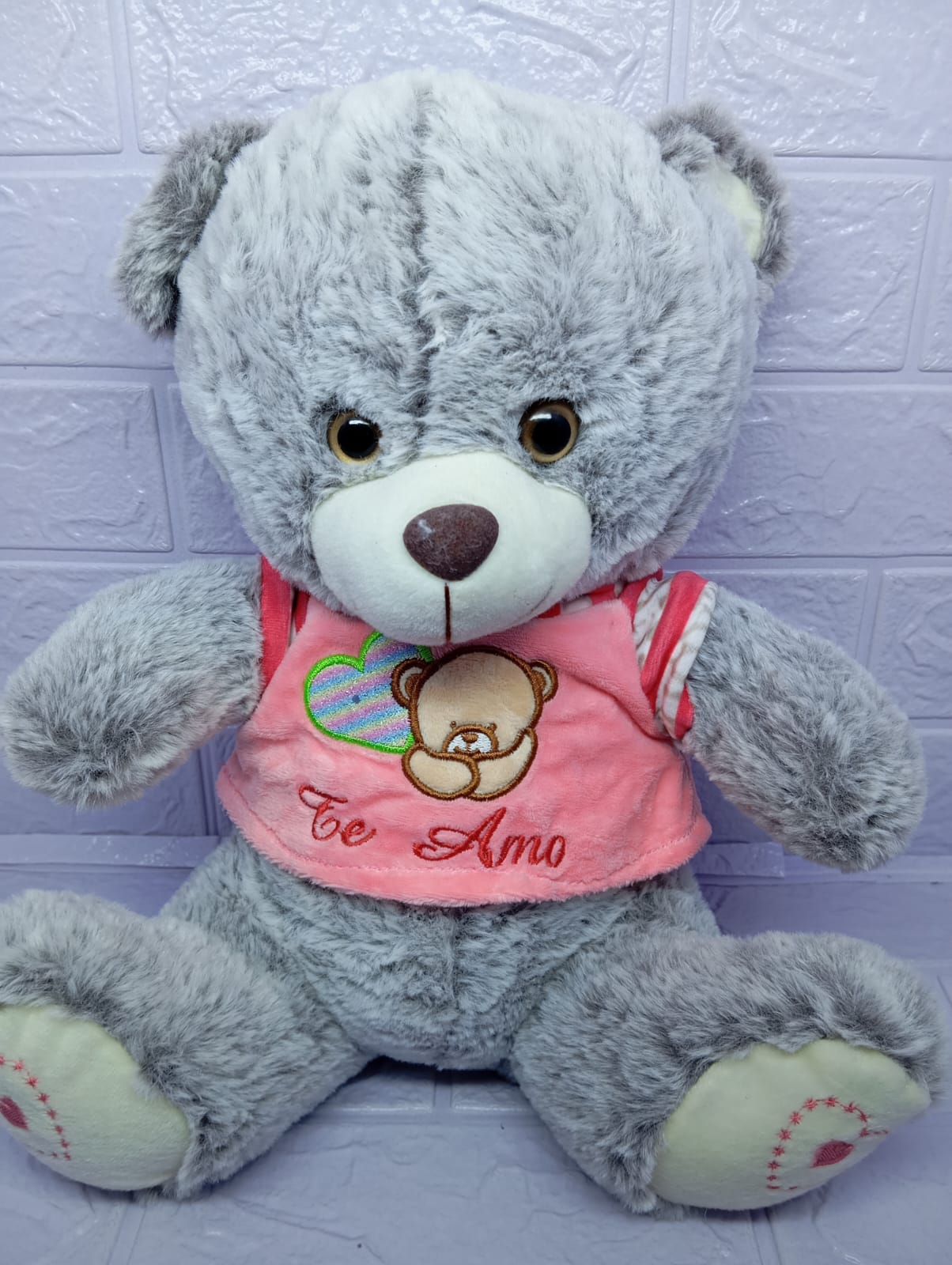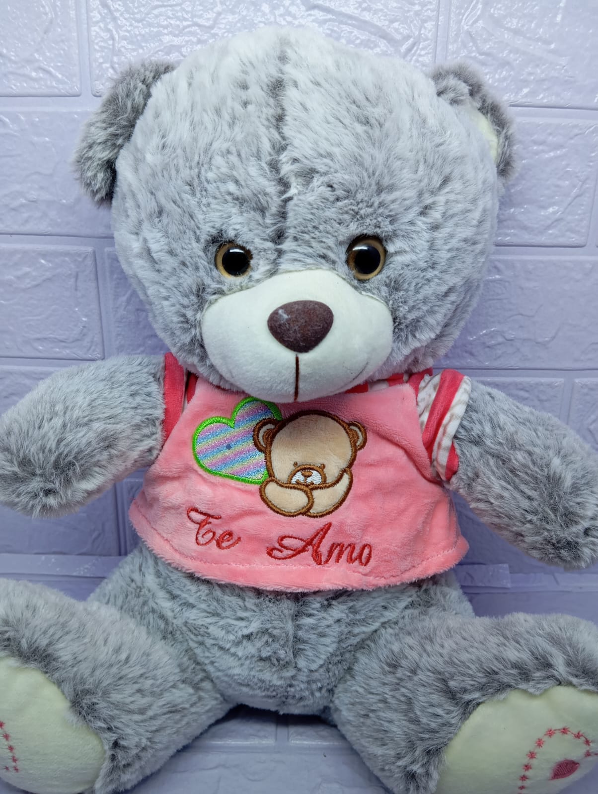 Oso de peluche color plomo de 35 cm, con un delicado polo rosado que resalta su ternura. Al presionarlo, activa una dulce melodía que lo convierte en un detalle musical perfecto para regalar amor y alegría en cualquier ocasión especial.