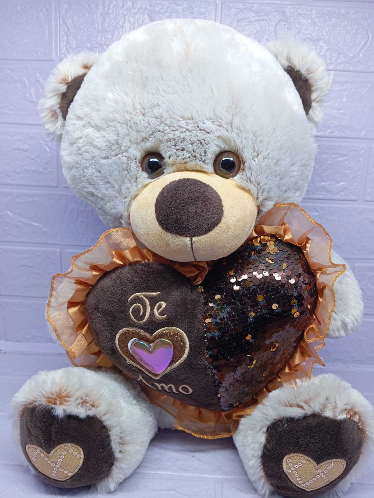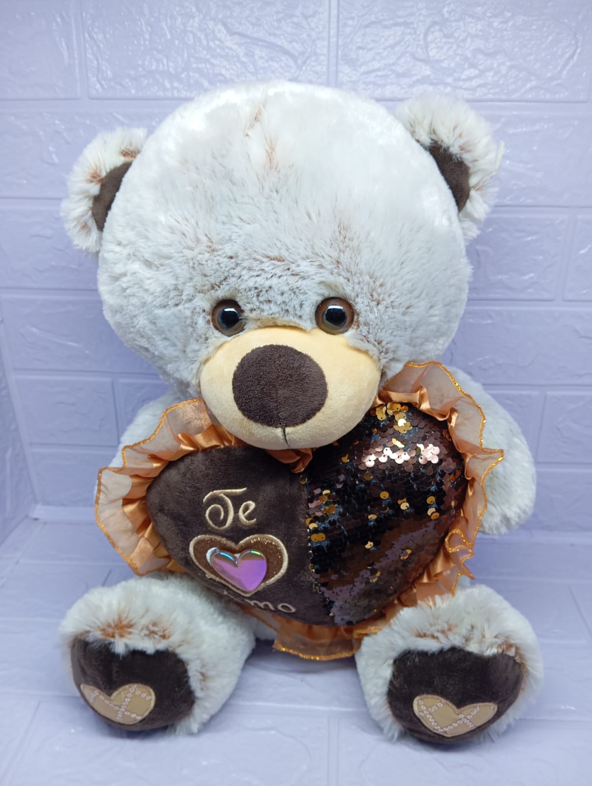 Oso jaspeado color plomo de 50 cm, con un hermoso corazón marrón que resalta su estilo sobrio y delicado. Su textura suave y su detalle musical lo convierten en un regalo perfecto para expresar amor con elegancia y ternura.