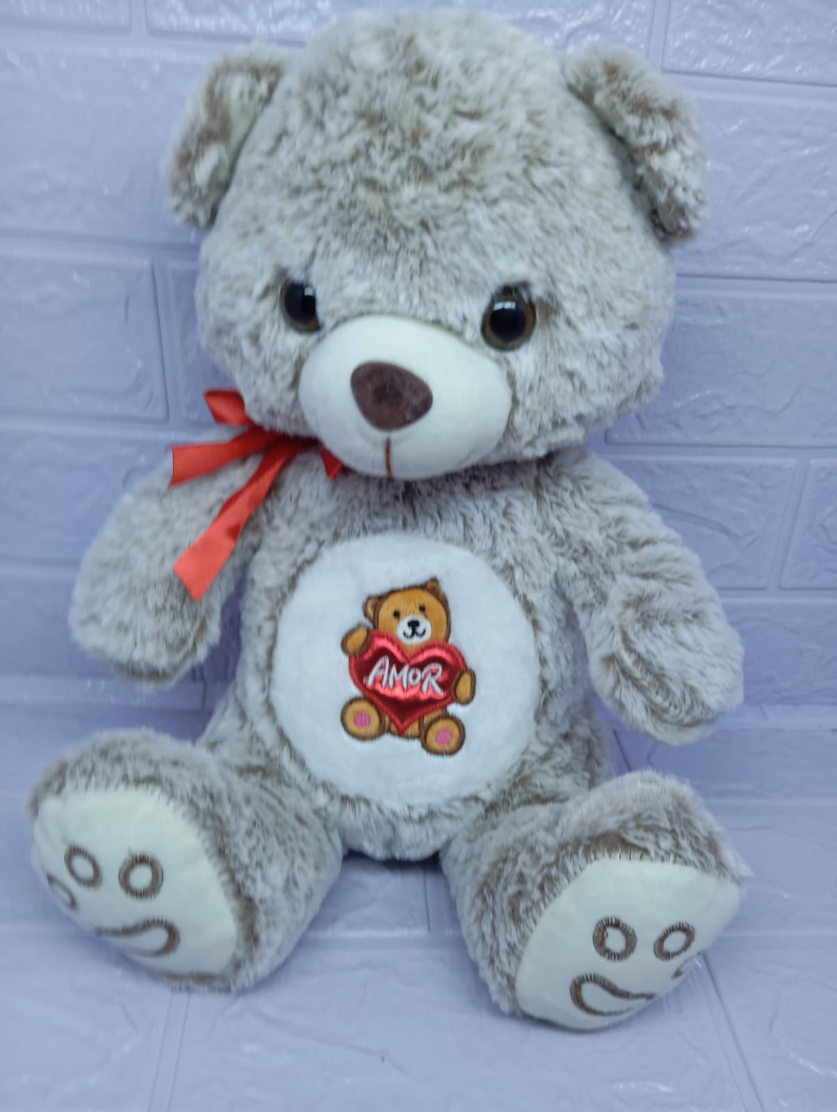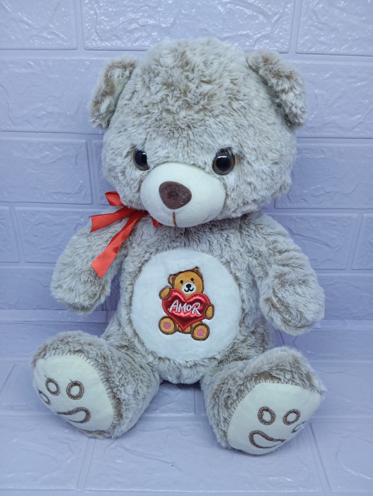 Encantador oso de peluche color plomo de 35 cm, con un hermoso bordado en el pecho de un osito con corazón, que resalta su ternura. Lleva un delicado lazo rojo en el cuello y cuenta con un detalle musical que lo convierte en el regalo perfecto para sorprender con dulzura y estilo.