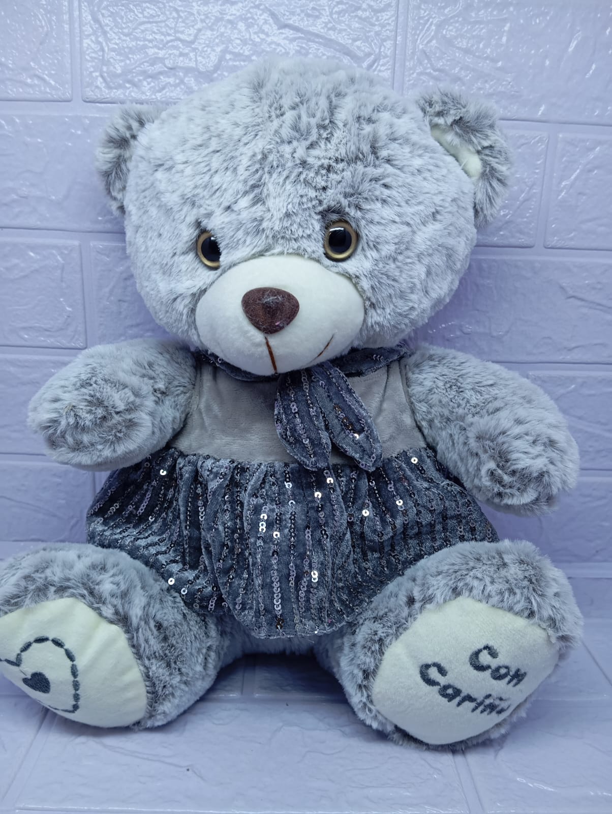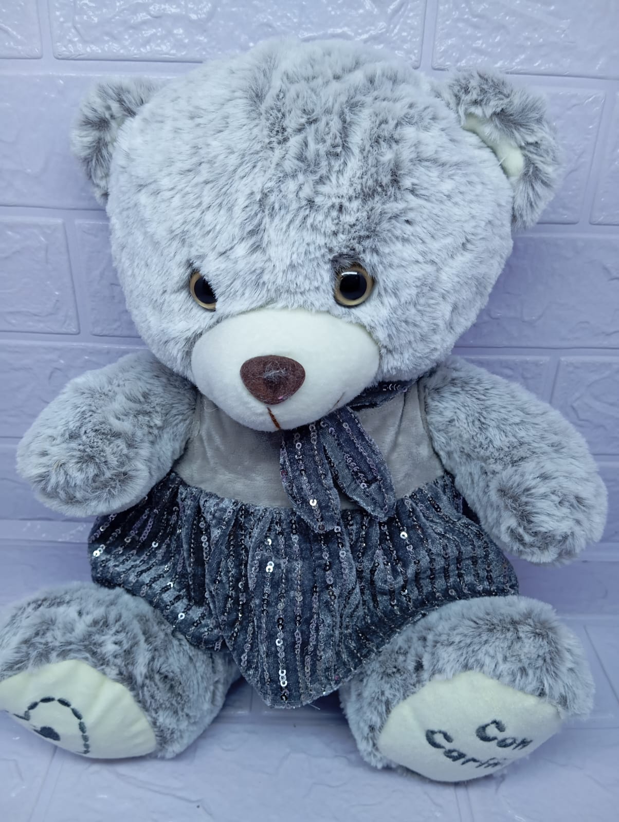 Oso de peluche de 30 cm, hermoso y delicado, con un encantador vestido en el pecho que resalta su ternura. Incluye un detalle musical que se activa al presionarlo, convirtiéndolo en el regalo ideal para expresar cariño con dulzura y estilo.