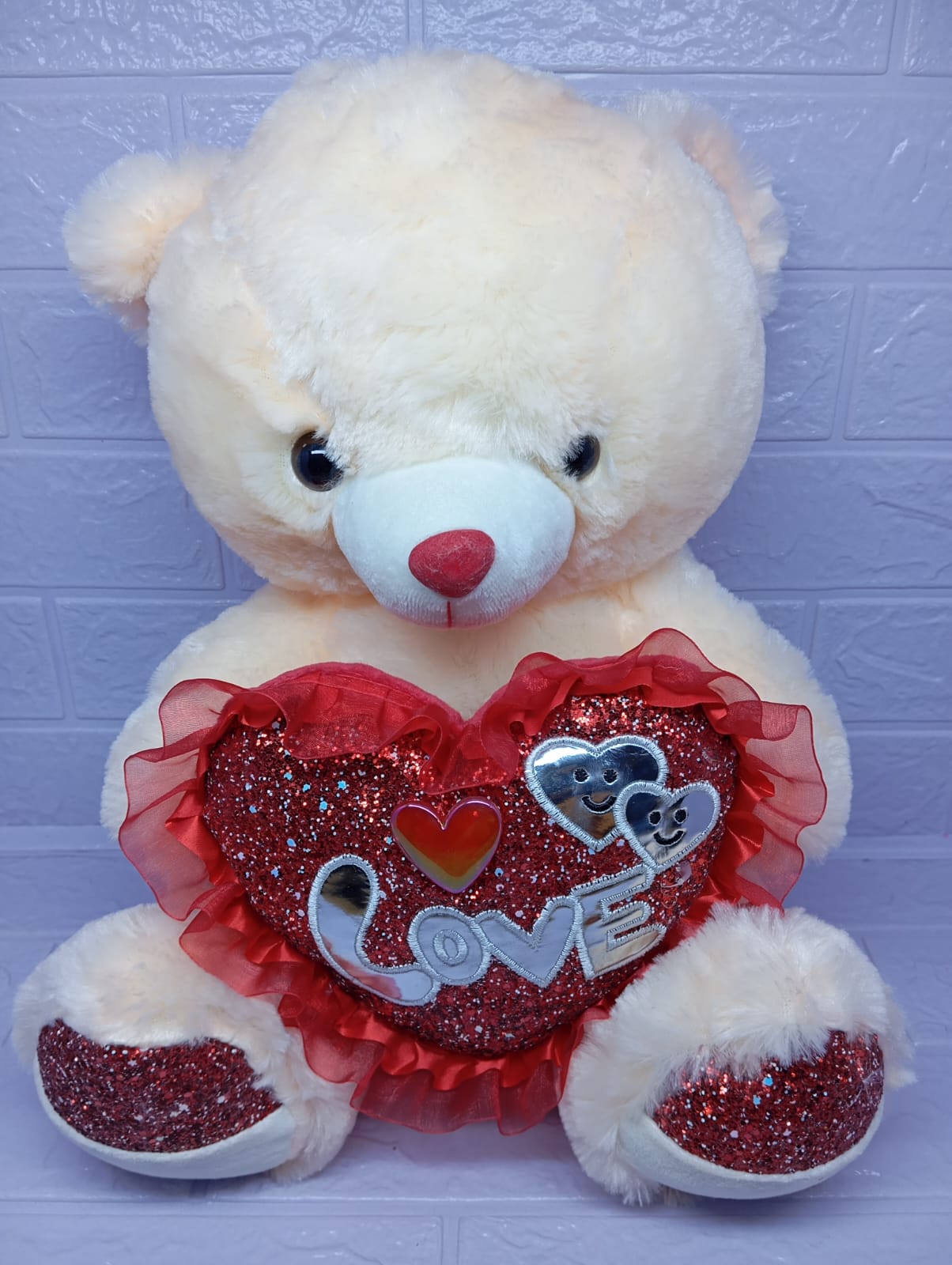 Oso de peluche de 50 cm, suave y abrazable, con un hermoso corazón escarchado en tono rojo que brilla con ternura. Al presionarlo, reproduce una dulce melodía, convirtiéndolo en un detalle musical precioso para enamorar y emocionar en cualquier ocasión especial.