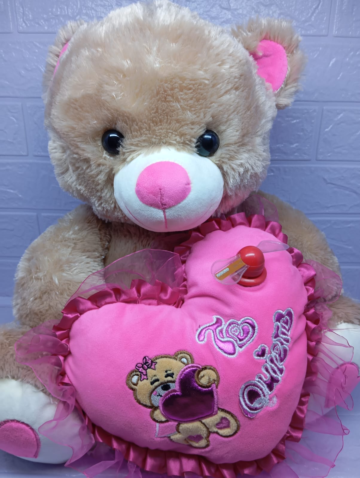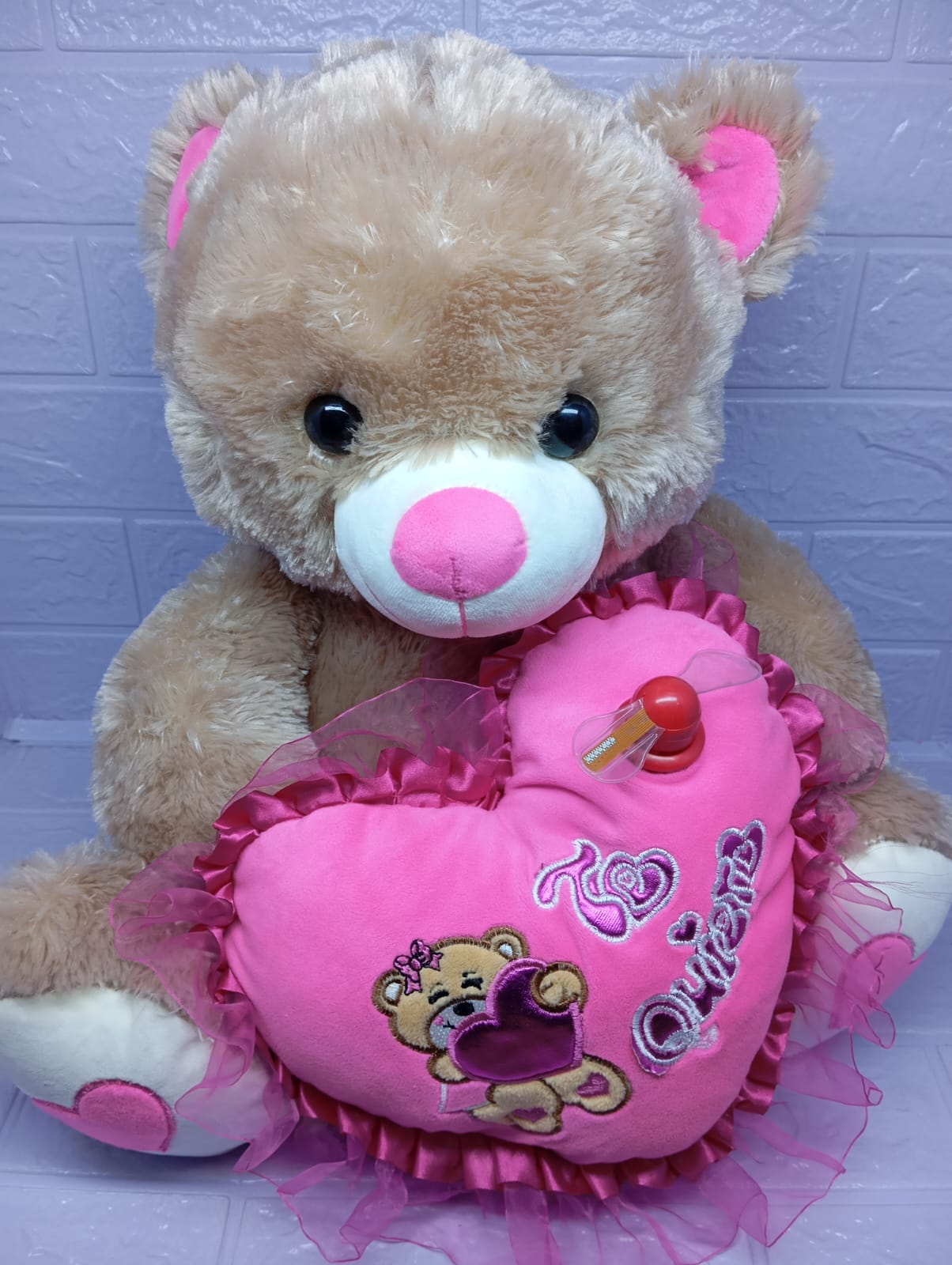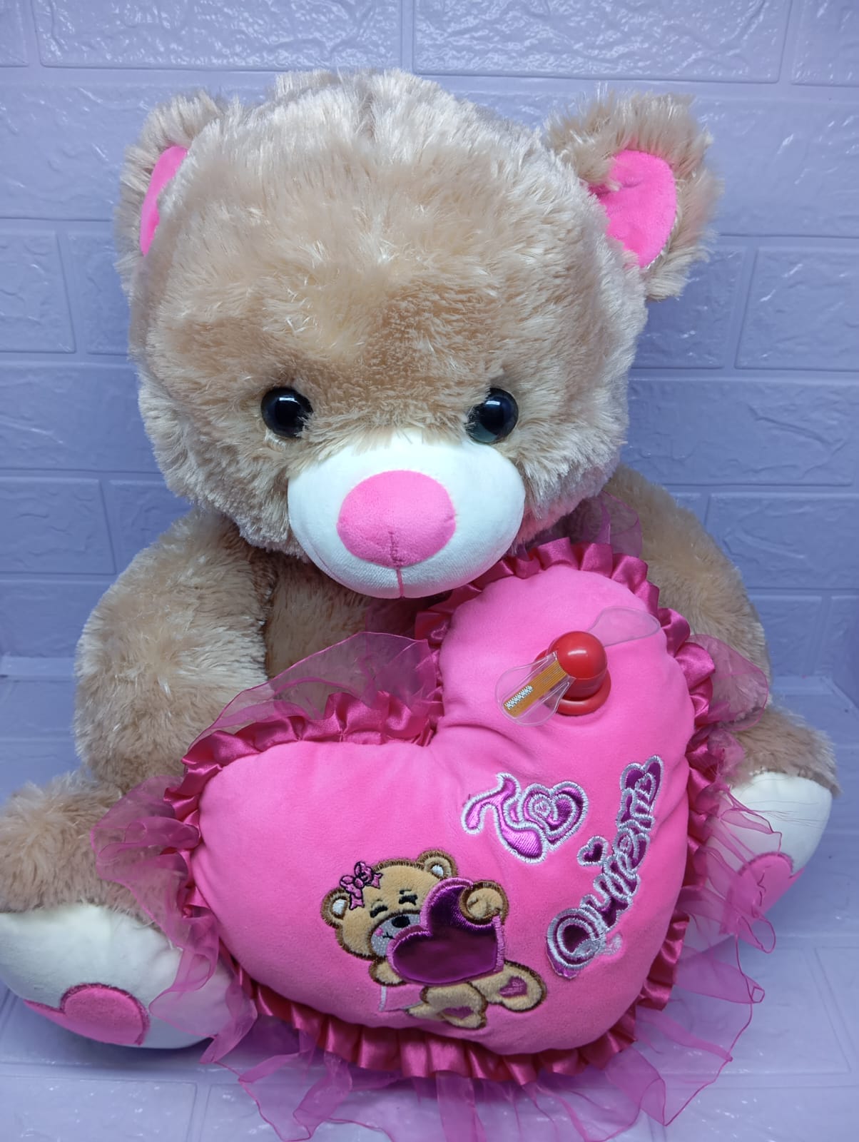 Oso de peluche de 50 cm, suave y musical, con un adorable aspa que lleva frases como 'Te quiero' y 'Con cariño'. Un detalle grande, tierno y lleno de amor que al presionarlo reproduce una dulce melodía, ideal para sorprender con un mensaje especial.