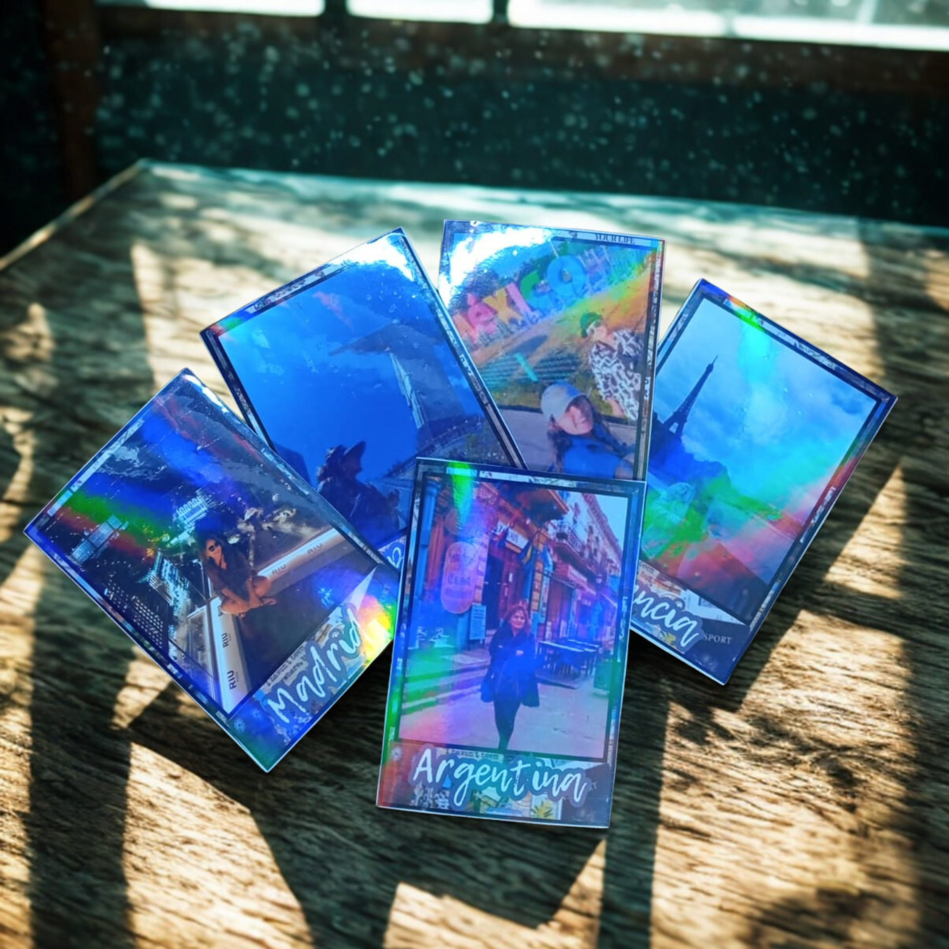Haz que tu regalo sea único con este hermoso pack de 6 fotos estilo Polaroid (6 cm x 9 cm), completamente imantadas y laminadas con acabado holográfico, lo que les da un brillo encantador y moderno.