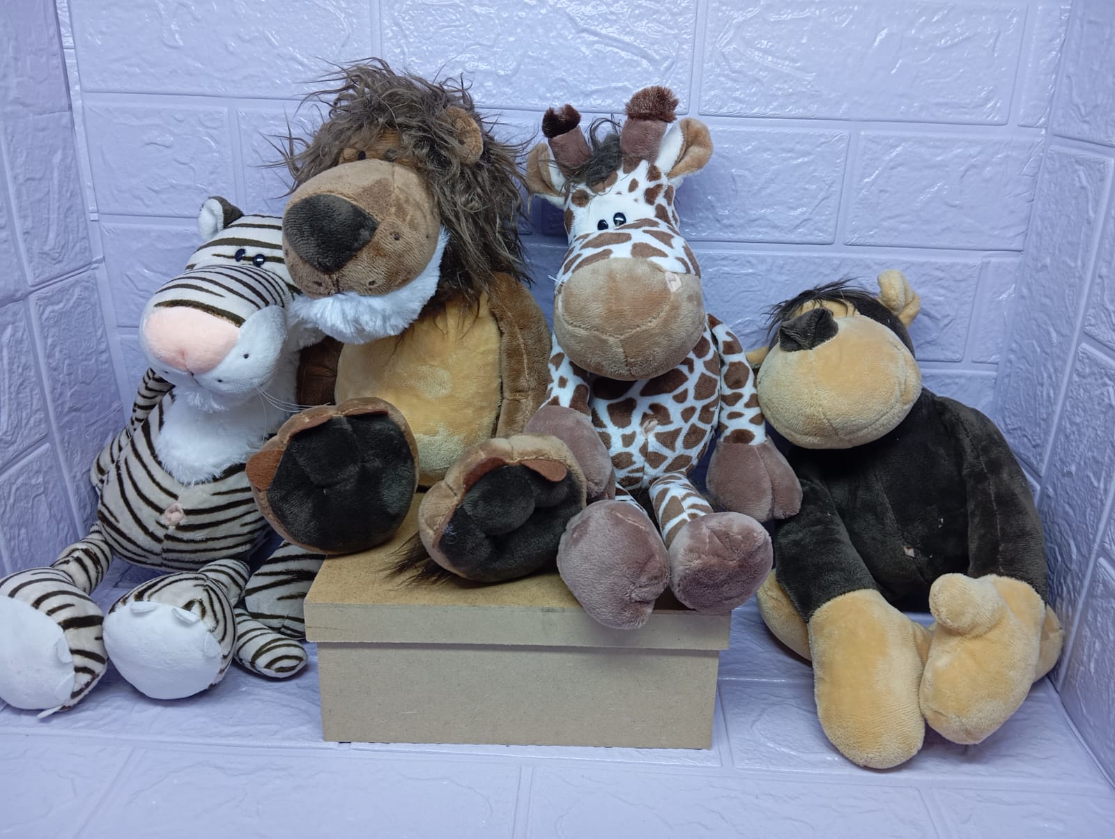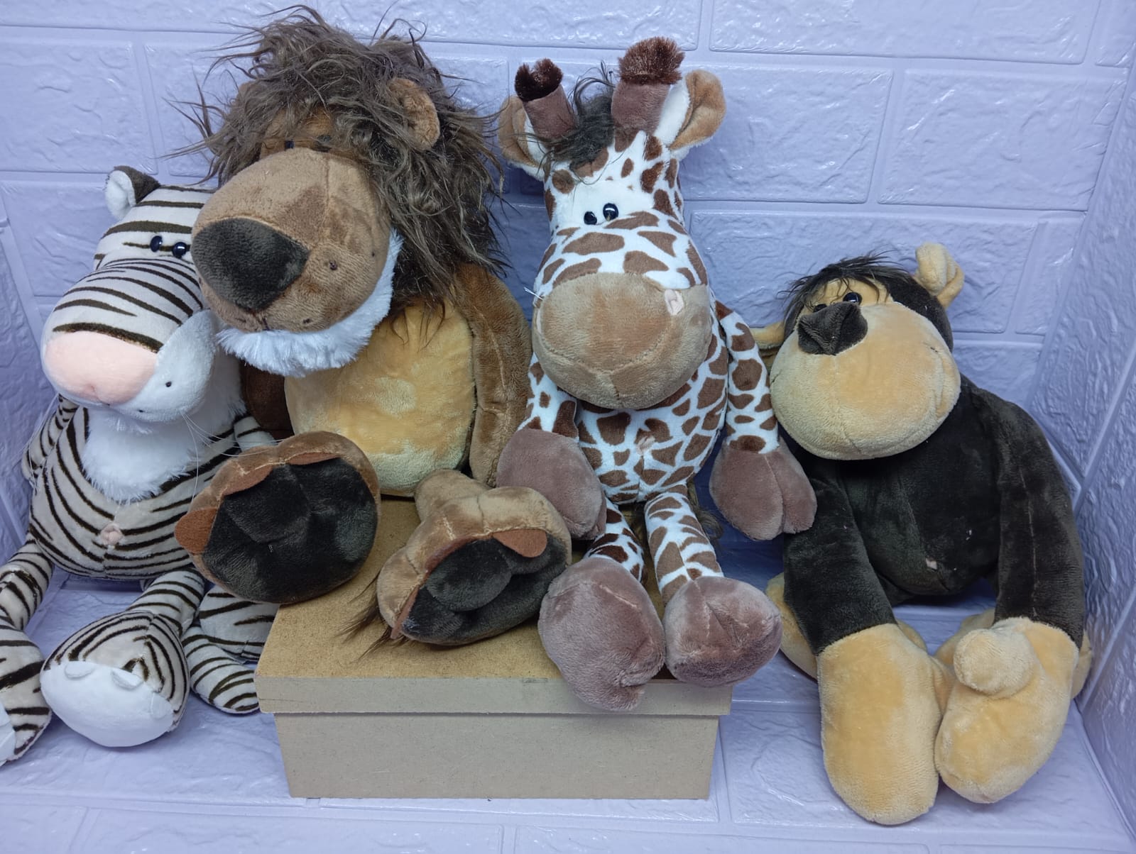 Juego de 4 adorables peluches de fieras de la selva de 35 cm, cada uno con sonido que imita su rugido o llamado natural. Suaves, divertidos y llenos de personalidad, son el regalo perfecto para pequeños aventureros o amantes de la naturaleza.