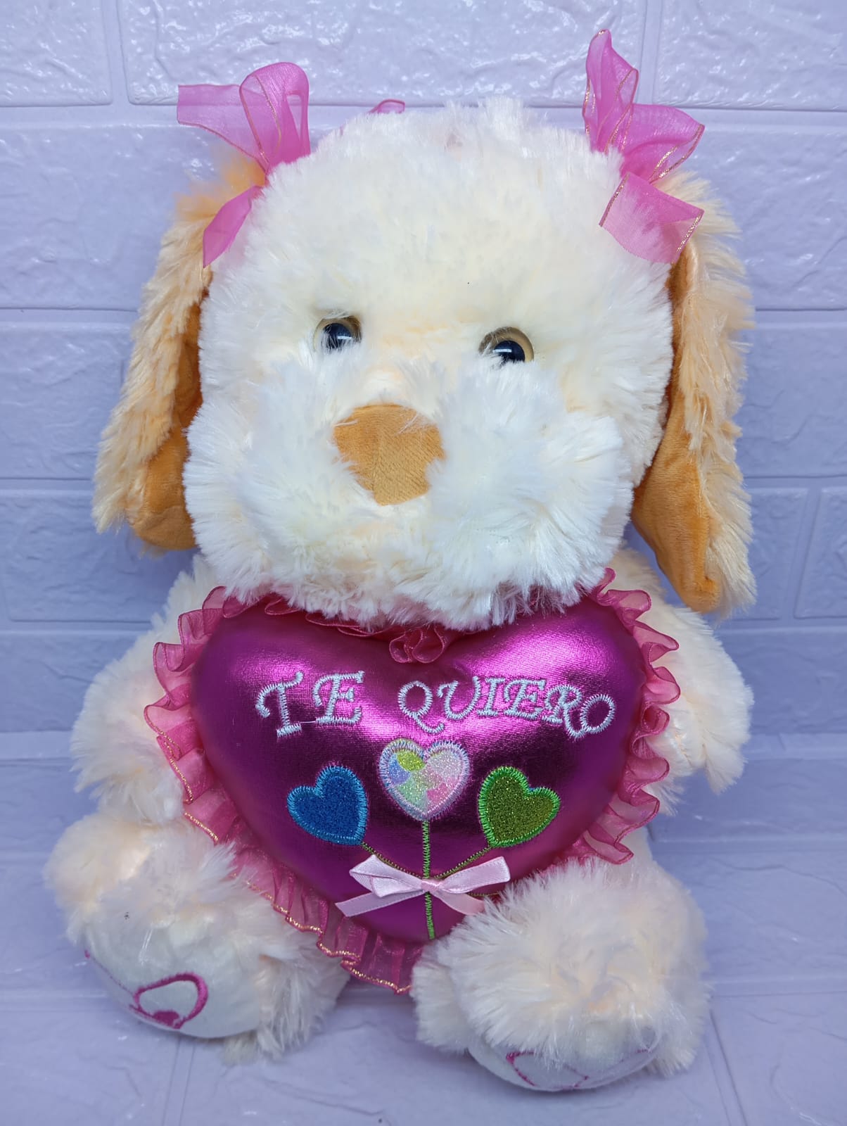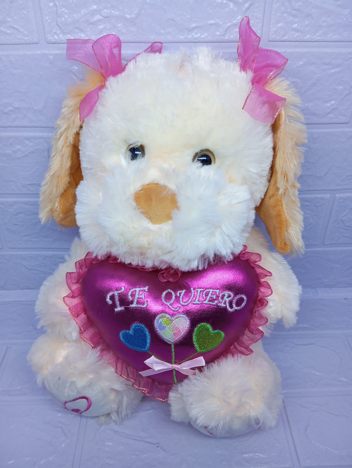 Tierno peluche de perrito de 33cm con un corazón fucsia que dice 'Te quiero', ideal para expresar amor de forma especial. Emite una melodía encantadora al presionarlo, convirtiéndolo en un detalle musical lleno de ternura, perfecto para sorprender con cariño.