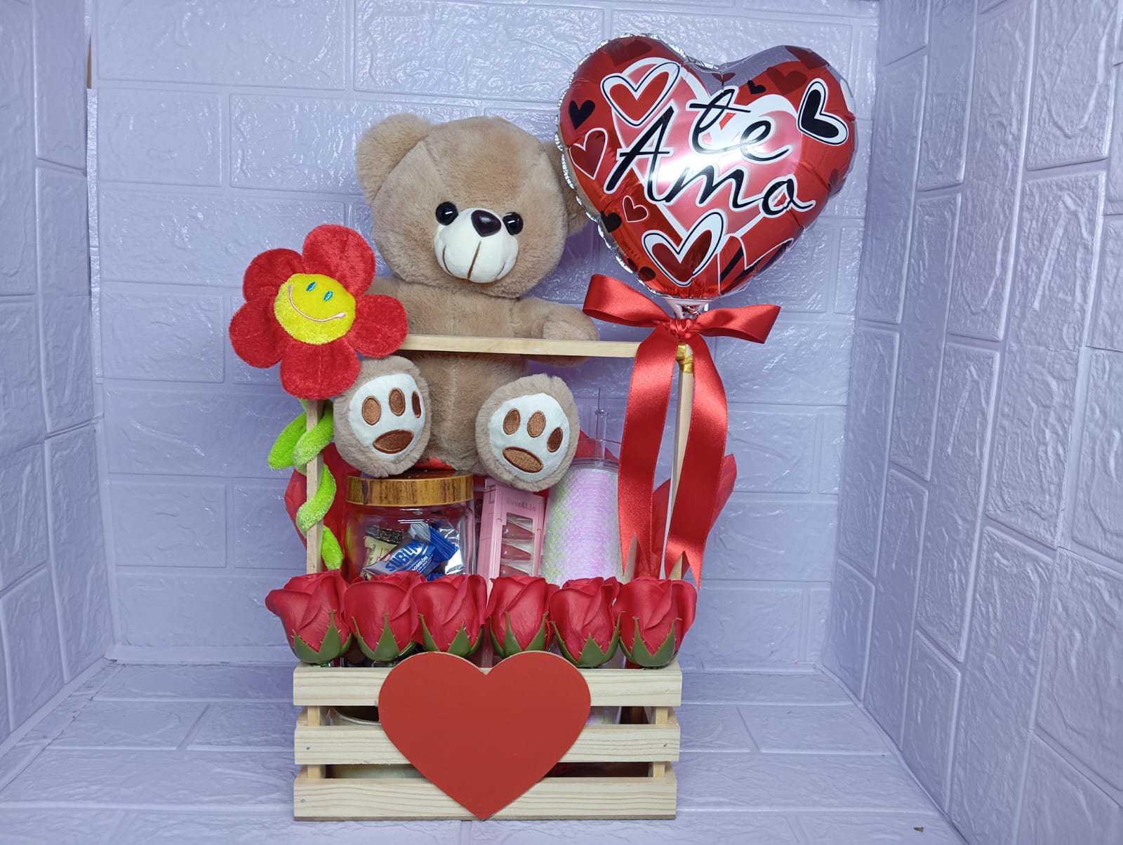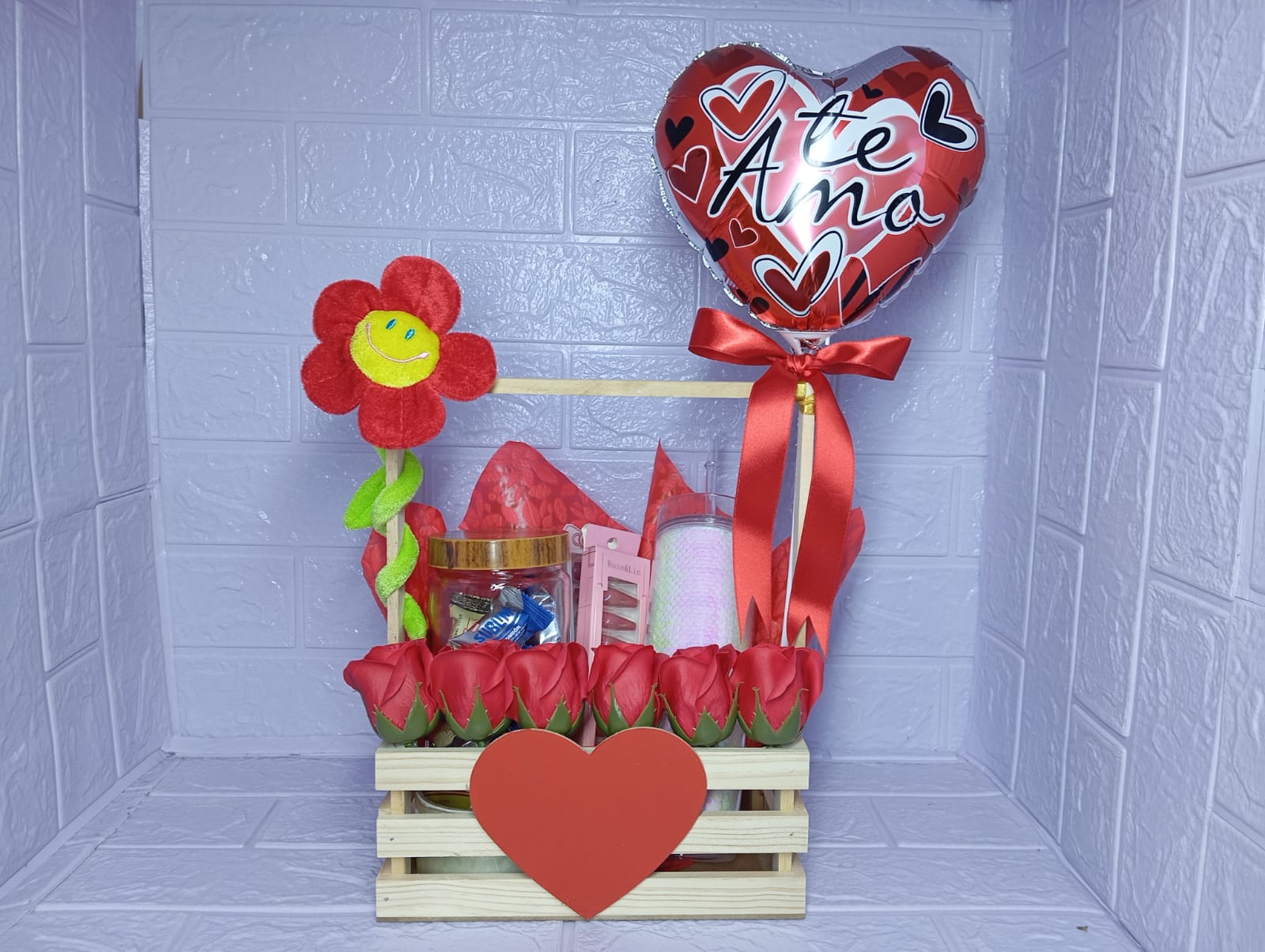 Incluye un adorable corazón decorativo, 6 rosas rojas de jabón con un aroma delicioso, una flor de peluche, un pomo de vidrio lleno de chocolates, 2 sets de uñas en colores variados y un tomatodo elegante, ideal para consentir a esa chica especial.