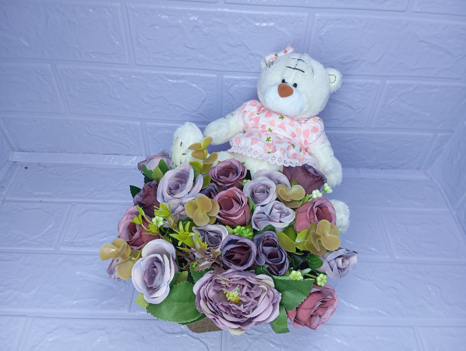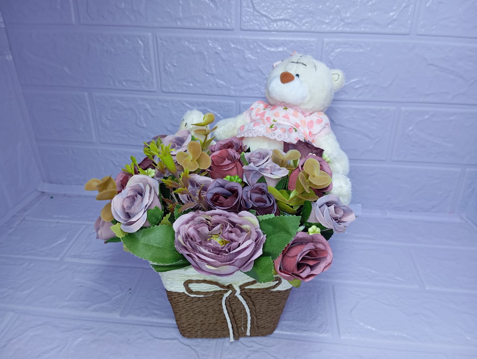 Un arreglo en canasta lleno de encanto, decorado con hermosas flores artificiales en tonos lilas y morados, que transmiten calma, cariño y gratitud.