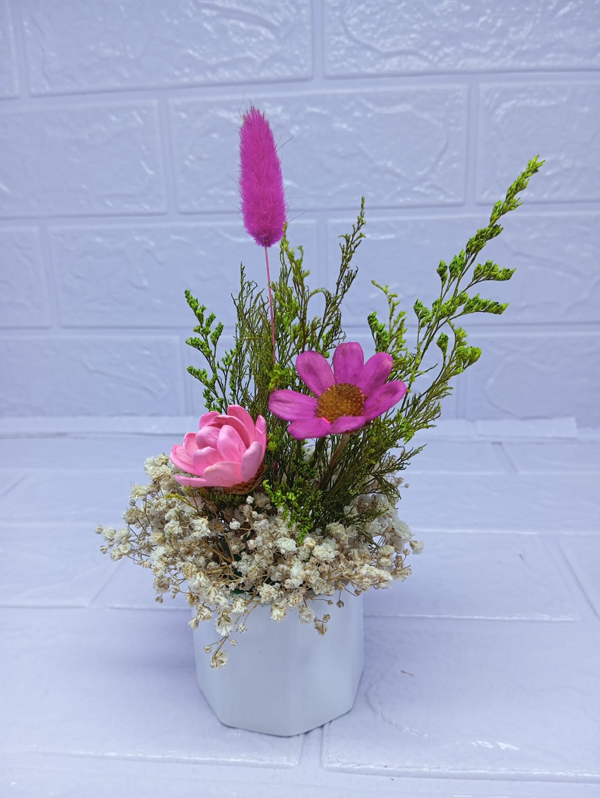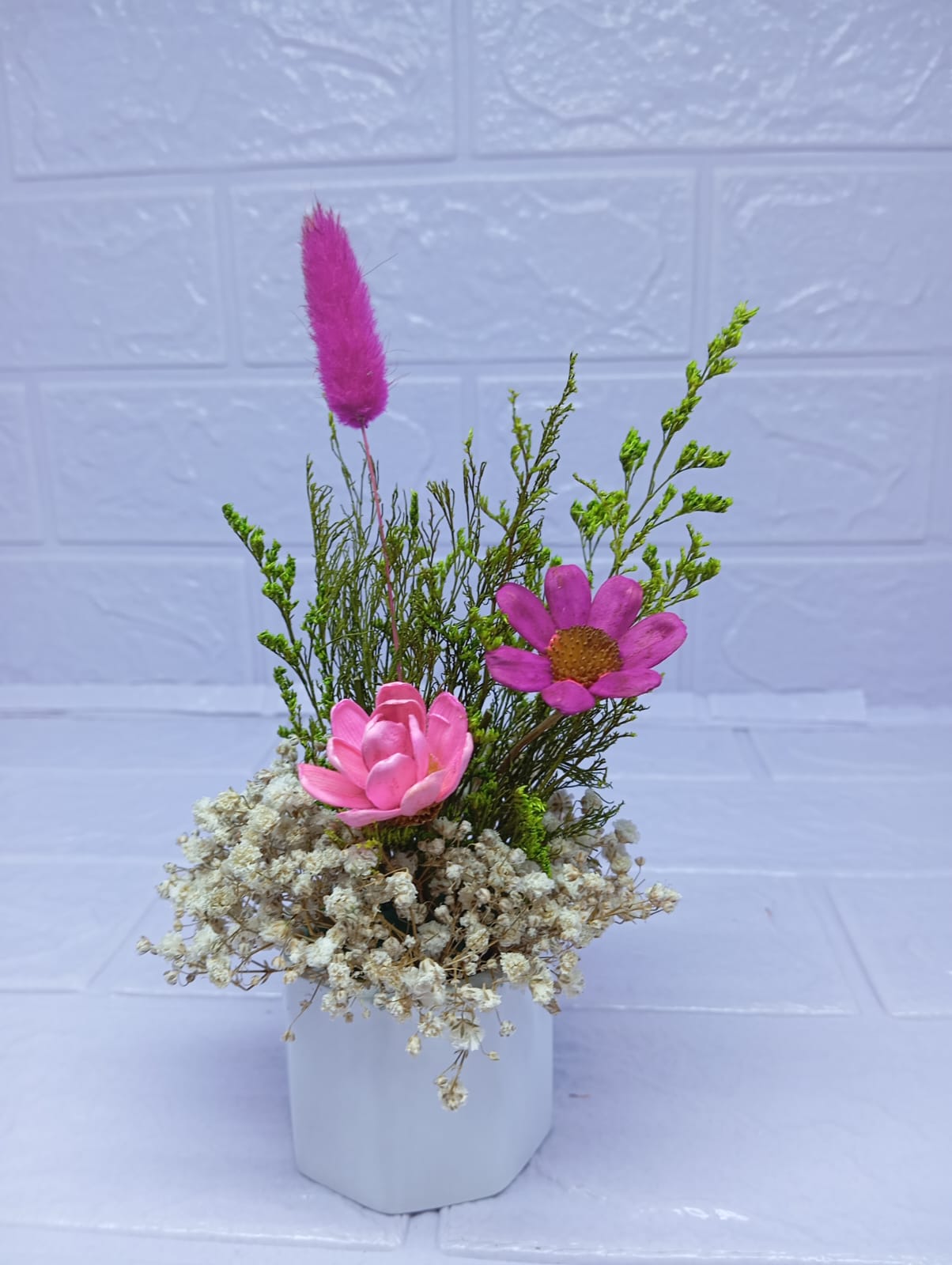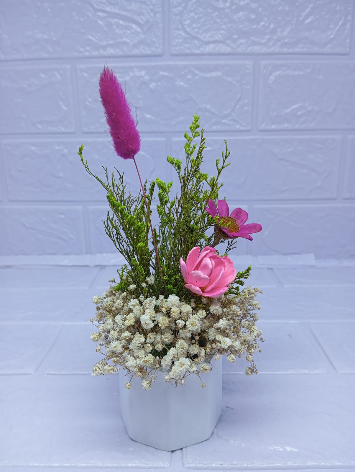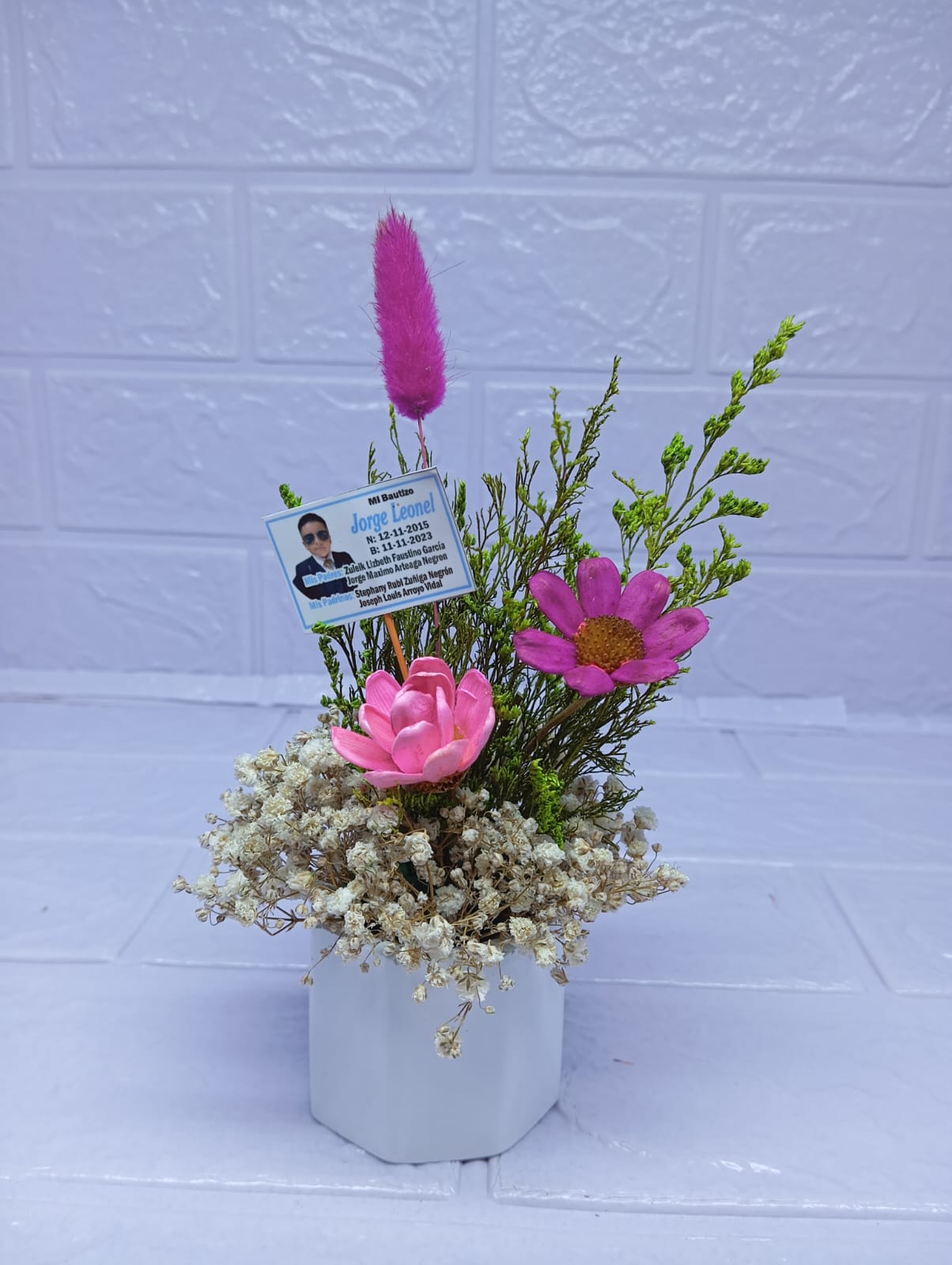 Un detalle simple y encantador con dos hermosas flores secas eternas, acompañadas de un follaje verde que resalta su frescura y armonía. Puedes elegir los colores de las flores y personalizarlo con tu logo, ideal para regalar con elegancia y estilo.